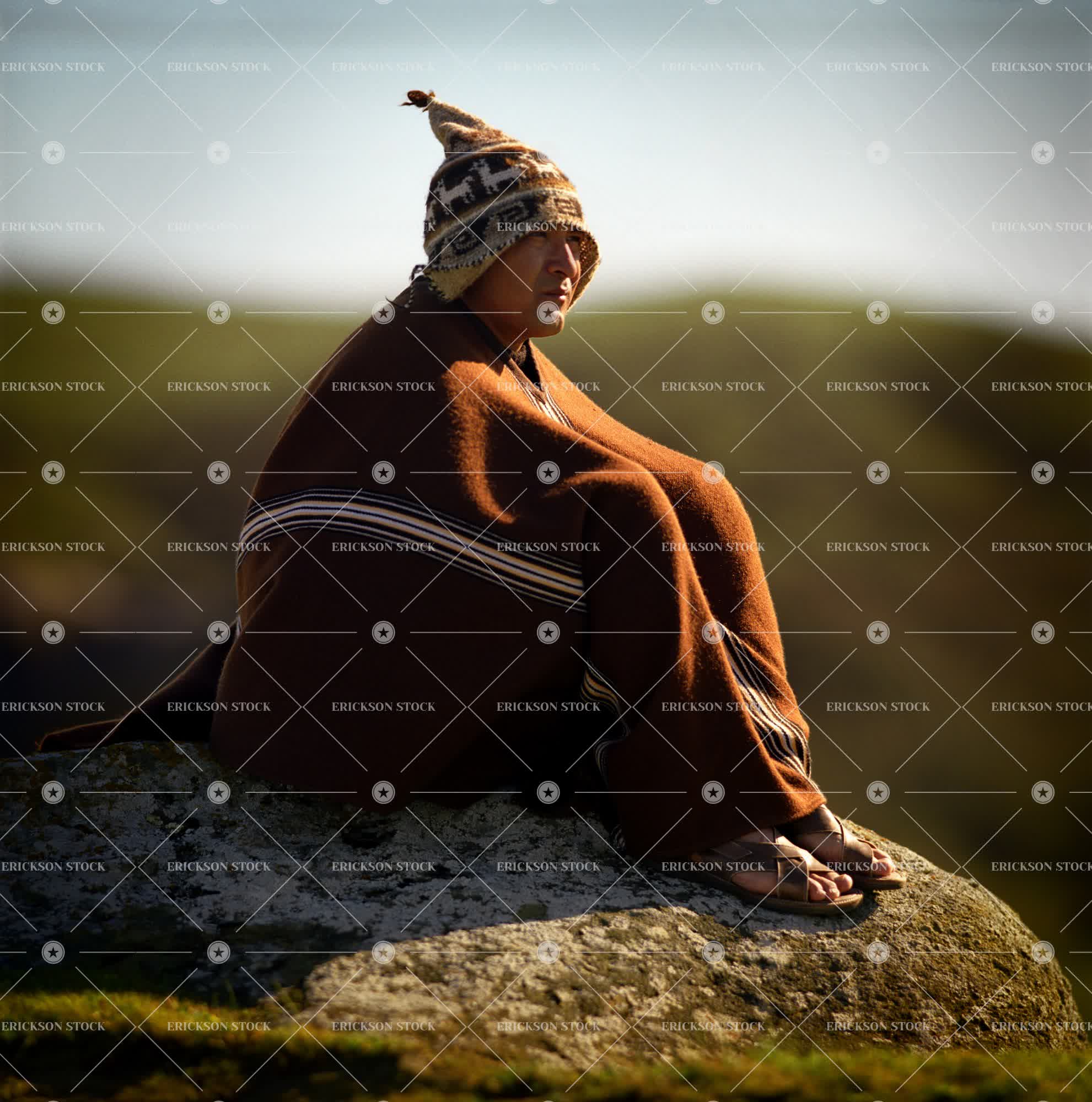 Tags accessory, adult, blanket, cap, cape, caucasian, chill, cloak, clothes, cold, consider, cool, day, exterior, exteriors, fellow, fellows, full body, full length, garment, garments, guru, guy, guys, hat, hats, headdress, headdresses, Headgear, headpiece, headpieces, leisure, leisure activities, leisure activity, leisure time, leisurely, male, man, meditation, meditations, mid adult, natural, nature, one person, only males, only men, outdoor, outdoors, Outerwear, outside, peace, peaceful, peacefulness, people, person, persons, poncho, ponchos, ponder, pondered, pondering, ponders, profile, profiles, Quiet, quietly, remote, remoteness, rock, rocks, rocky, sat, seated, serious, seriously, seriousness, Side view, side views, sit, sits, sitting, solemn, solemnly, somber, spare time, spiritual, spiritualism, spirituality, spiritualness, square, square image, squares, stone, stones, thing, thinking, tradition, traditional clothing, traditional dress, traditions, tranquil, tranquility, vertical, vertically, verticals, western european