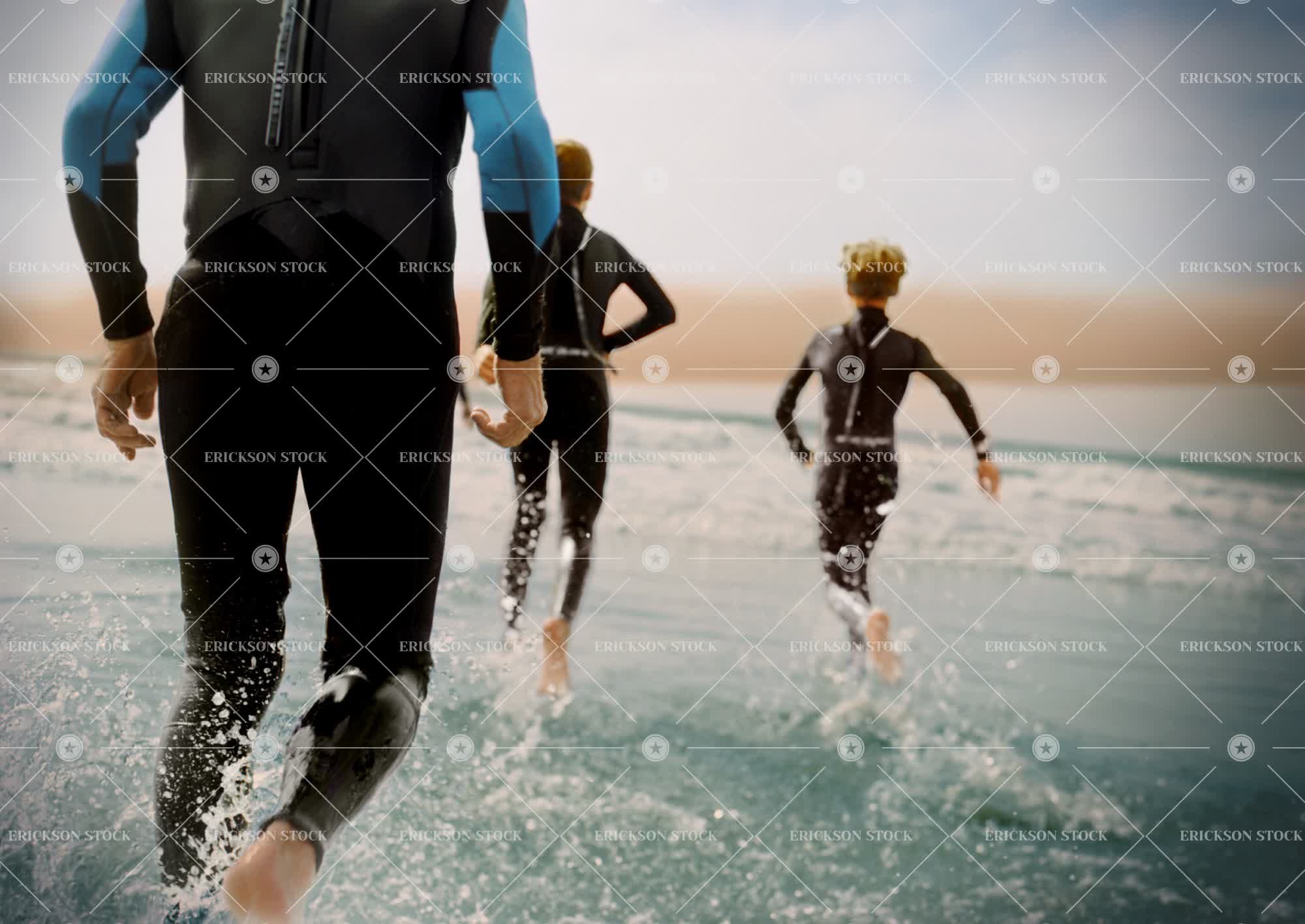 Man and his sons running through the water in wetsuits