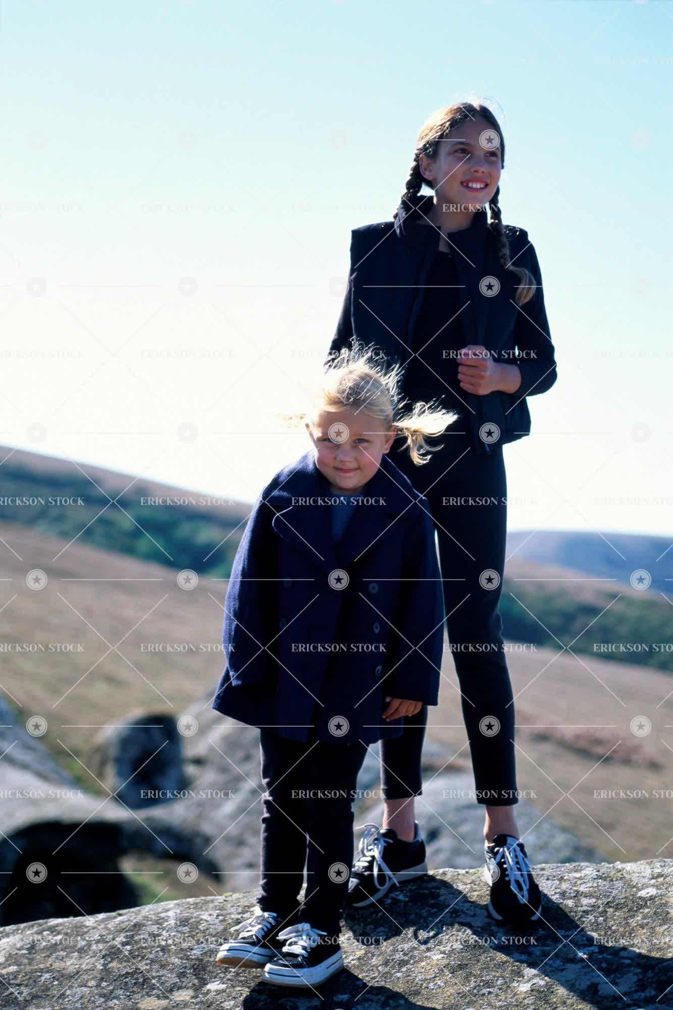 Tags adventure, blond, braids, california, casual clothes, child, clear sky, coat, copy space, Cute, discover, Eye contact, Facial expression, female, Full-length portraits, girls, Grassland, Hairstyle, Human relationships, Independence, Looking, Marin County, Meadow, north america, outdoors, Outerwear, outside, Overcoat, people, Pigtails, portrait, Portraits, Pre-teen, rock, rocks, sisters, sky, Staring, USA