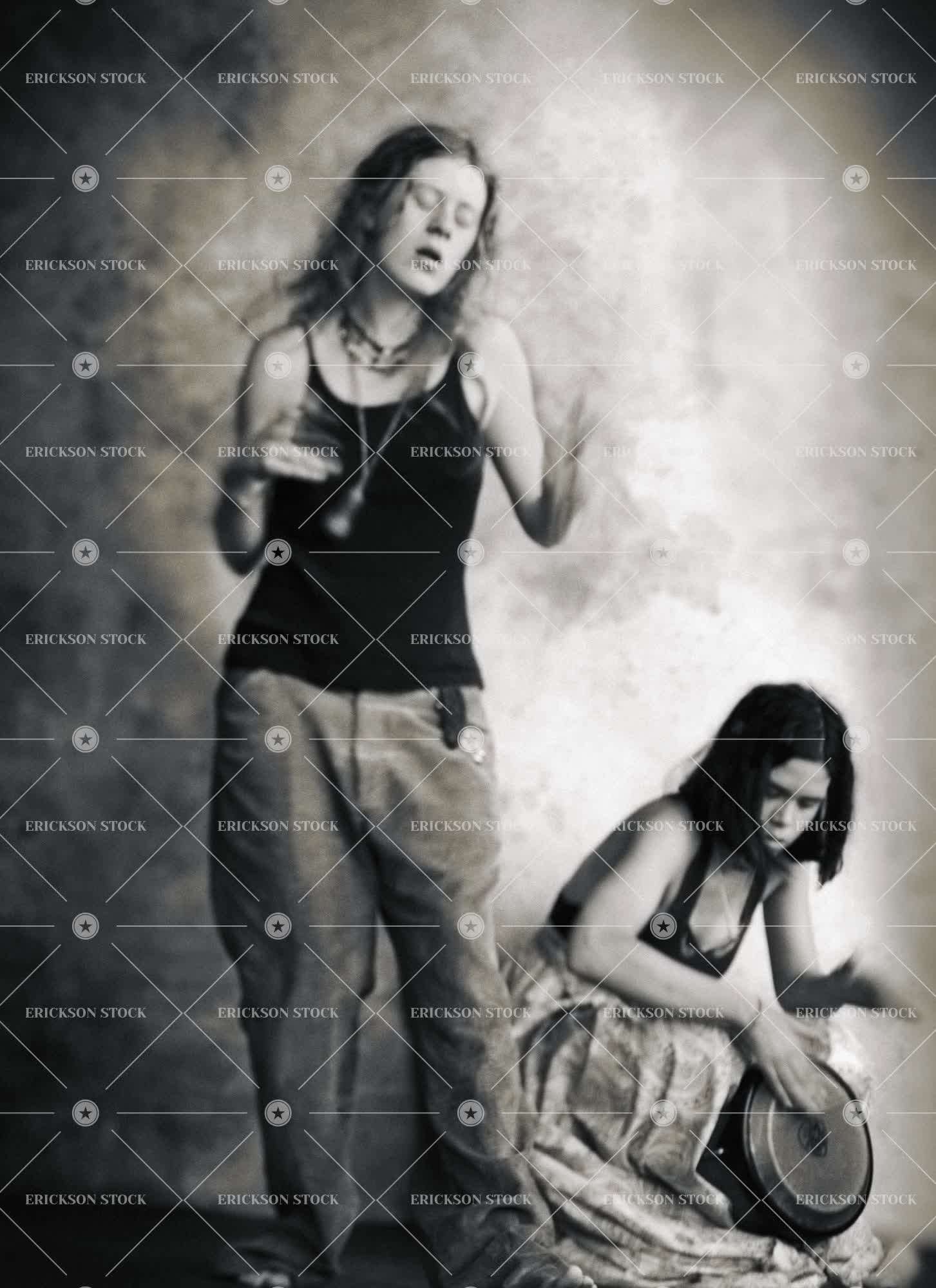 Teenage girl singing while her friend plays a drum.