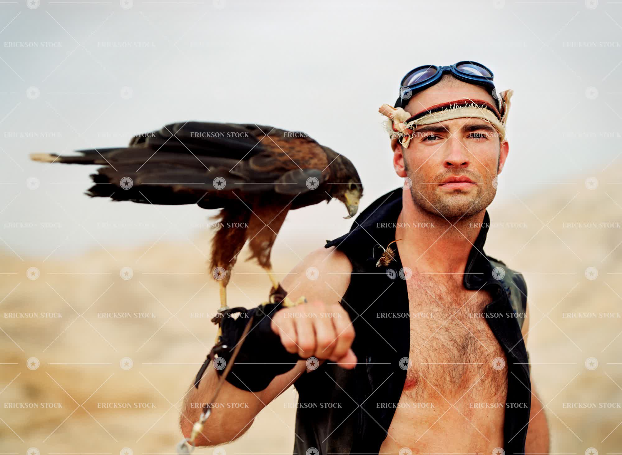 Portrait of an adventurous young man holding a bird of prey on his wrist while standing in a desert.
