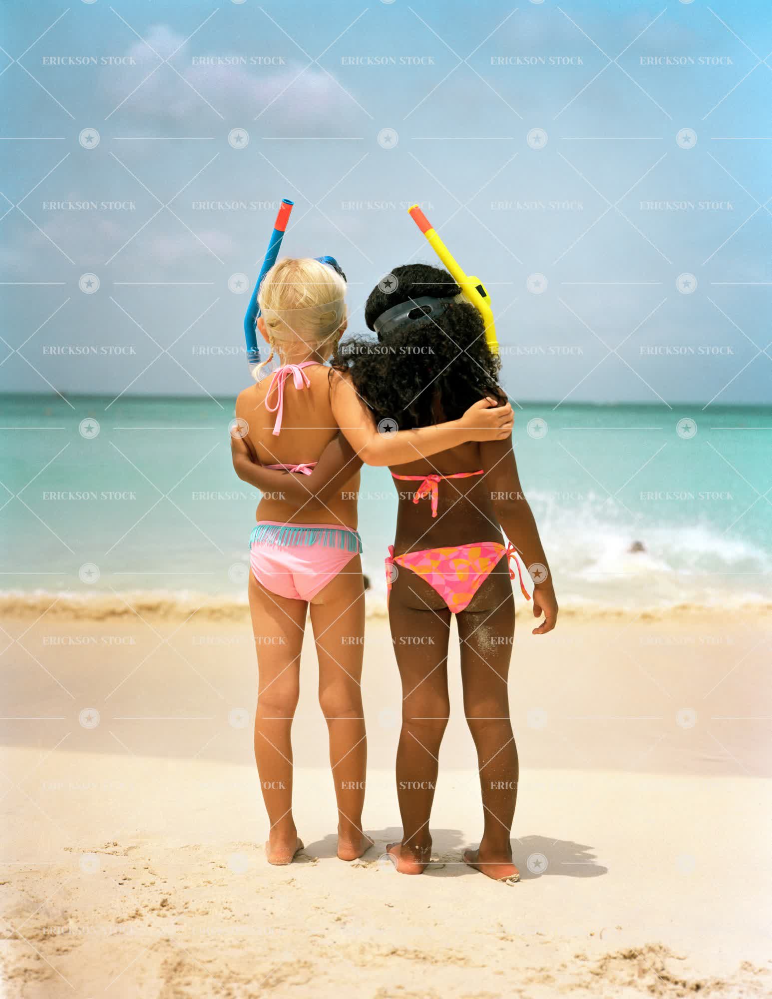 Tags adorable, affectionate, african american, arm around, back, back view, bathing suit, beach, bikini, caucasian, child, coast, Cute, day, female, friend, friends, friendship, full length, girl, girls, holiday, holidays, kid, kids, next to, ocean, outdoor, outdoors, outside, people, person, rear, rear view, scuba mask, sea, seaside, selective focus, shore, shoreline, shorelines, shores, side by side, snorkel, swimsuit, swimwear, together, togetherness, togs, two people, two piece, Vacation, vacations, vertical, water, water's edge