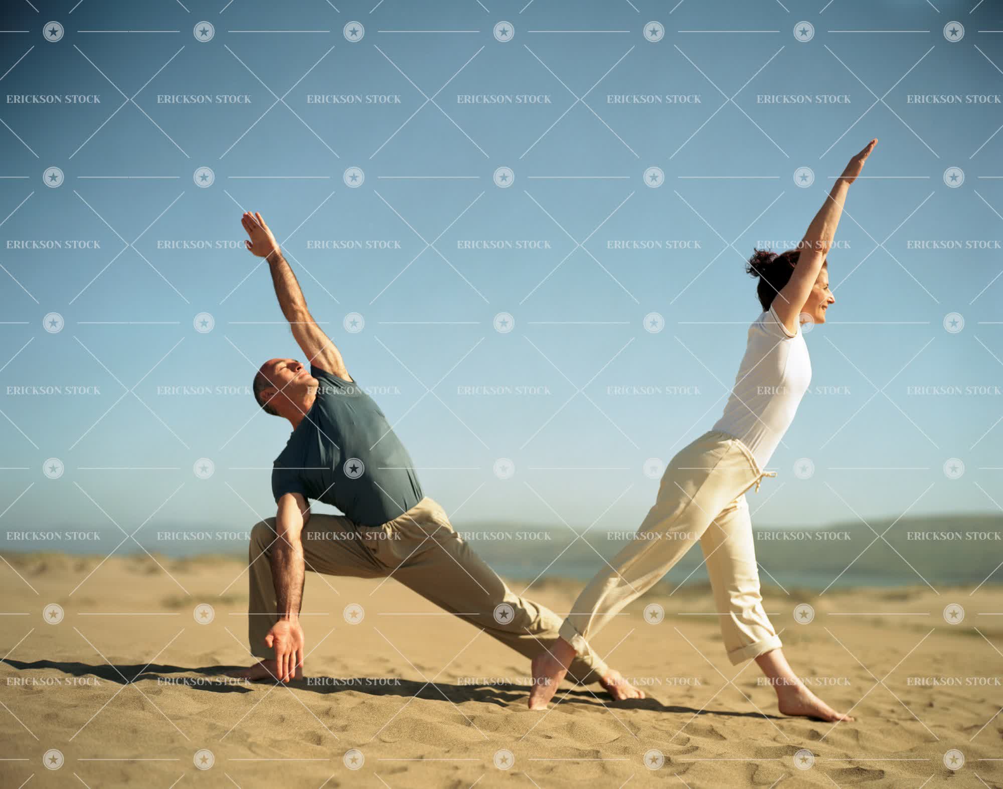 Happy mid adult couple practicing yoga together on a sandy beach.
