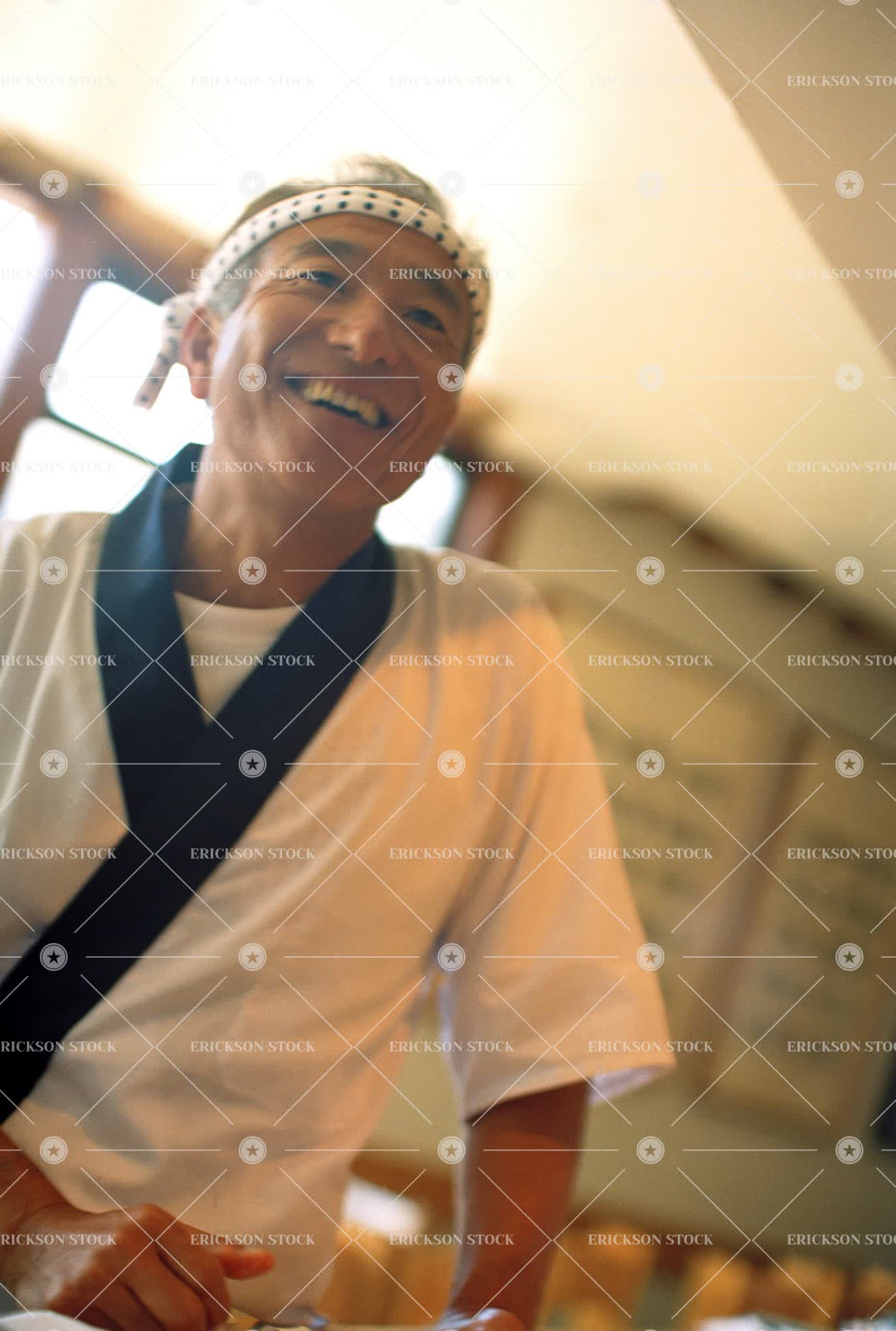 Tags adult, canted angle, chef, cook, copy space, copy space right, day, eateries, eatery, Food and drink, half length, happiness, happy, indoor, indoors, inside, japanese culture, japanese restaurant, japanese restaurants, low angle, low angle view, male, man, mature adult, mid adult, negative space, negative space right, oblique angle, one person, people, person, Restaurant, restaurants, smiling, Soft focus, tilt, tilted angle, traditional culture, vertical, waist up