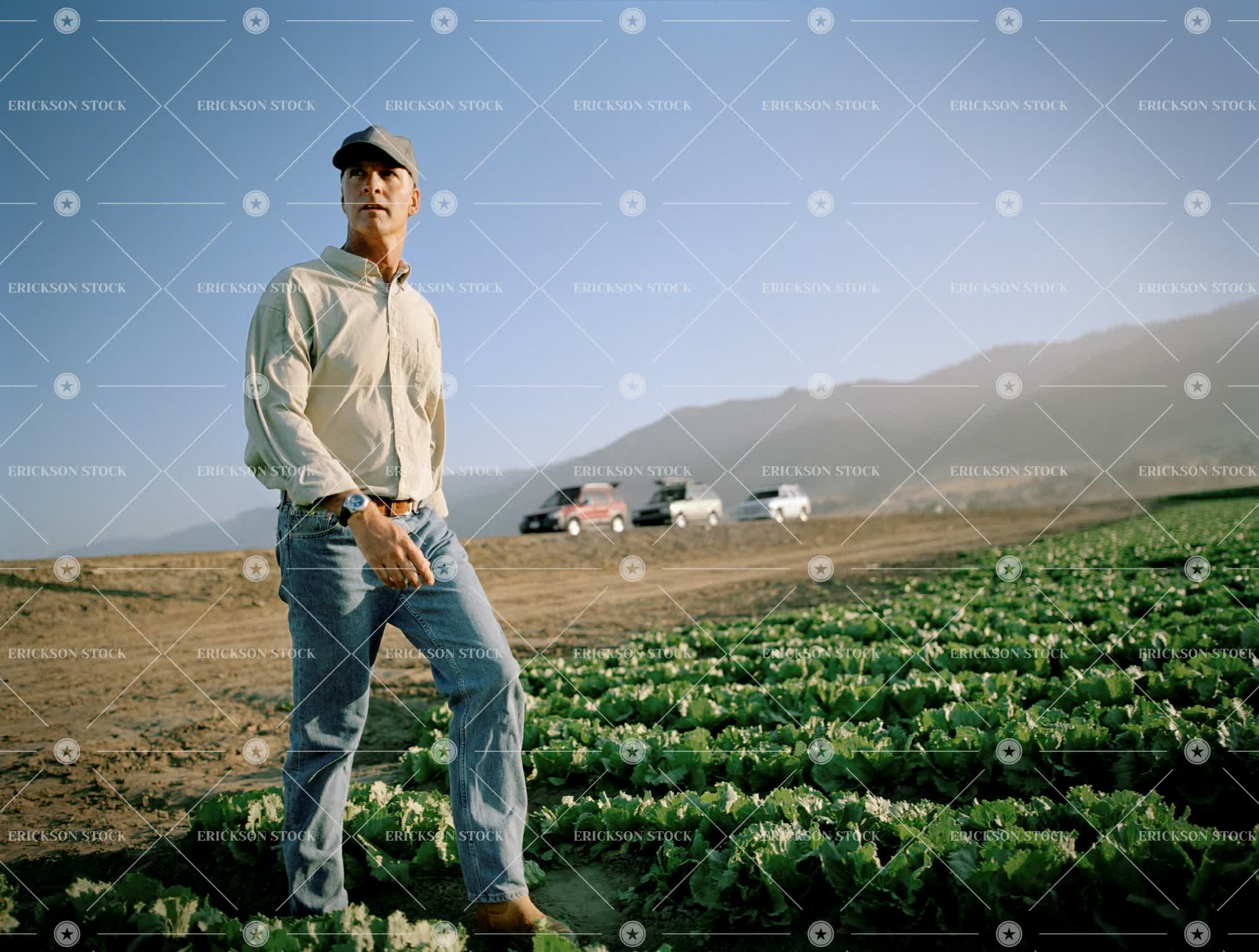 Tags agriculture, blue sky, car, caucasian, clear sky, confident, copy space, countryside, crop, day, environment, farming, farmland, farmworker, full length, growing, hat, horizontal, Landscape, low angle view, man, mature adult, nature, occupation, one person, only males, only men, outdoors, people, remote, rural scene, Transportation, viewing, Walking