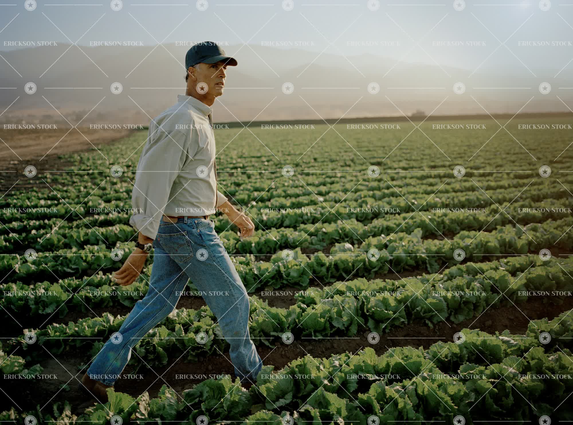 Tags agriculture, caucasian, copy space, countryside, crop, day, environment, farming, farmland, farmworker, growing, hat, horizontal, in a row, Landscape, man, mature adult, motion, nature, occupation, one person, only males, only men, outdoors, people, remote, rural scene, Side view, three quarter length, viewing, Walking