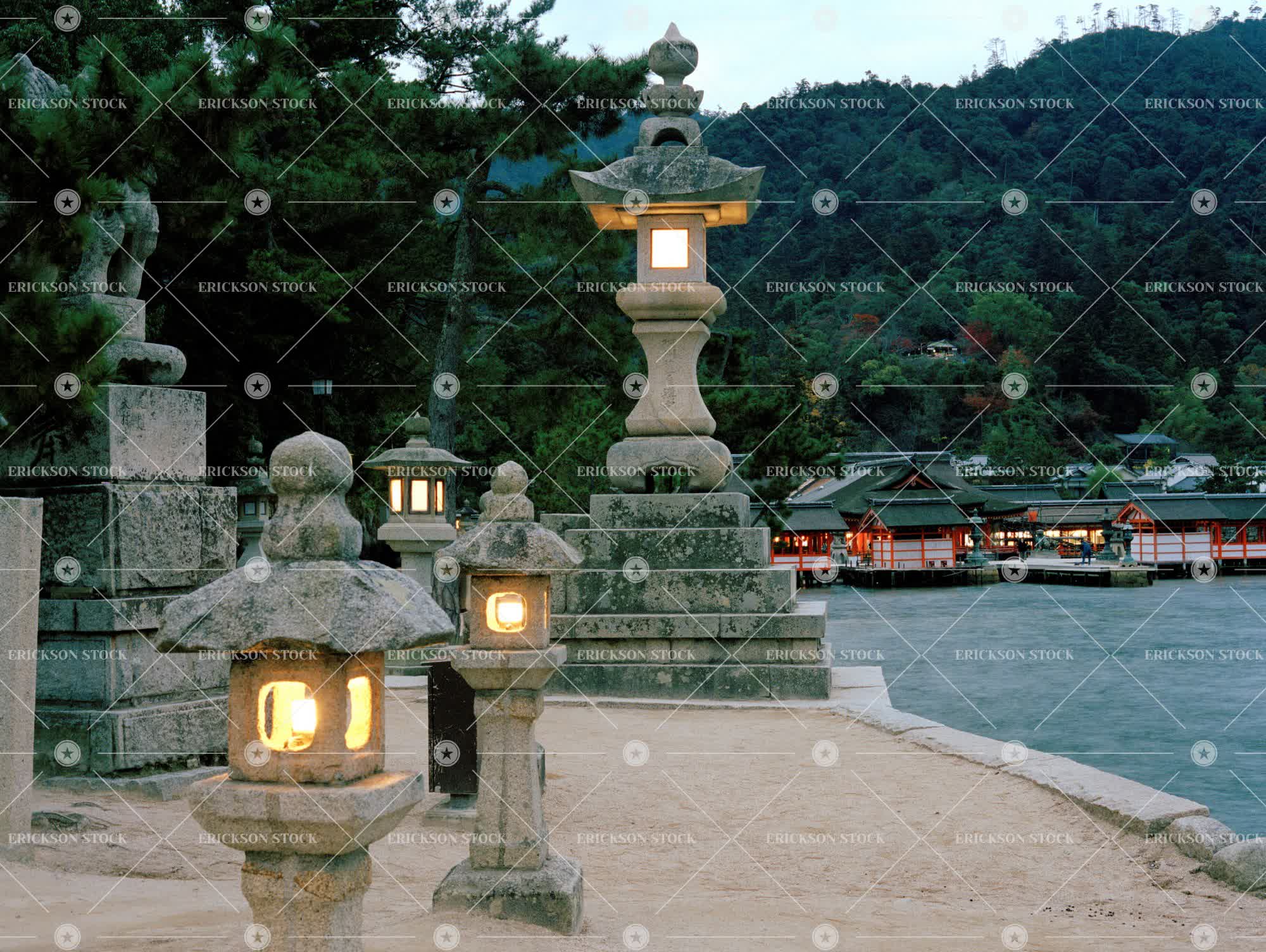 Illuminated old stone lanterns on a waterfront.