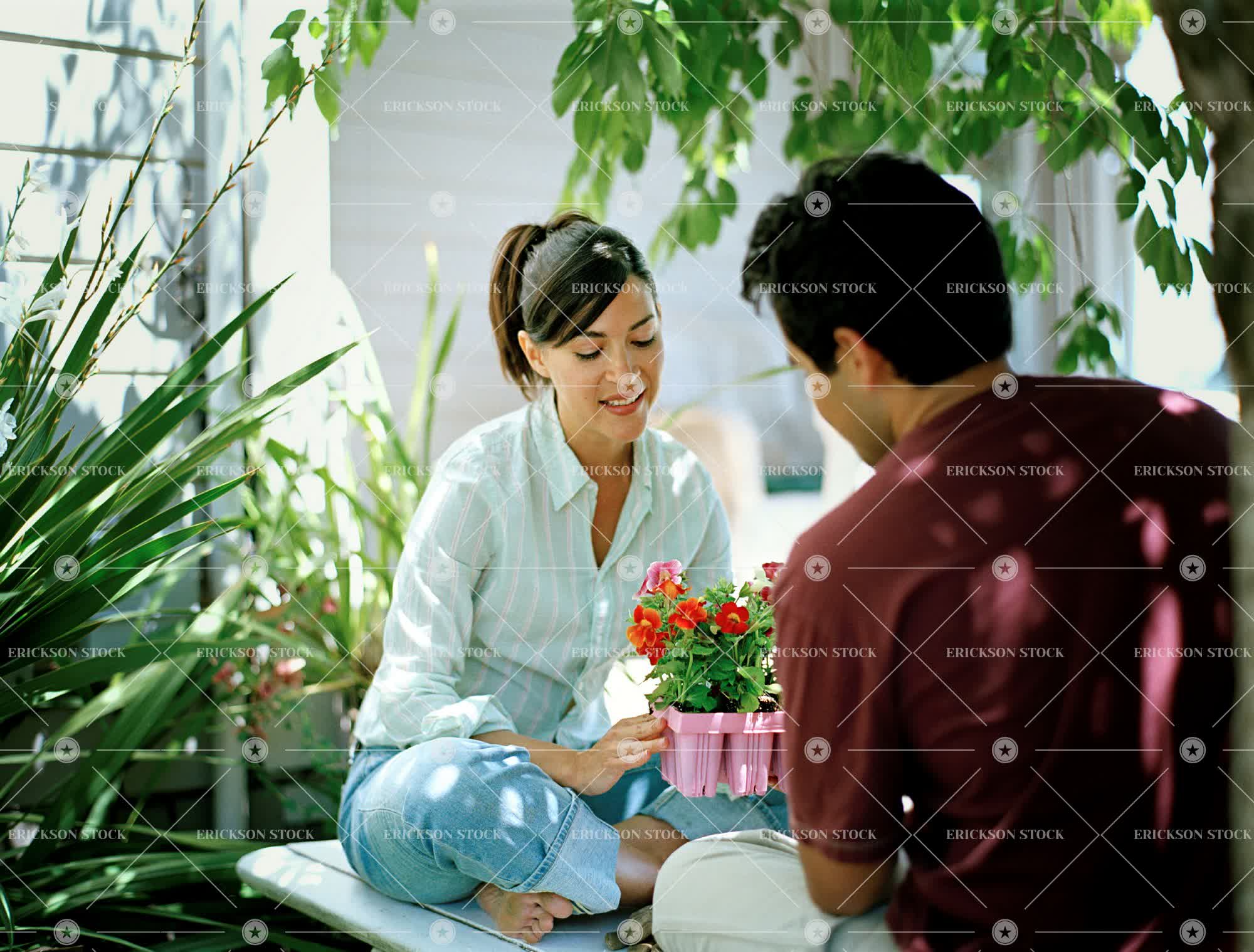 Tags boyfriend, caucasian, couple, cross-legged, day, domestic, environment, female, flower bed, flowerpot, friend, full length, garden, gardening, girlfriend, heterosexual couple, holding, horizontal, house, Husband, lifestyle, looking down, male, man, mid adult, nature, outdoors, people, rear view, spring, Summer, three quarter length, togetherness, two people, wife, woman, young adult