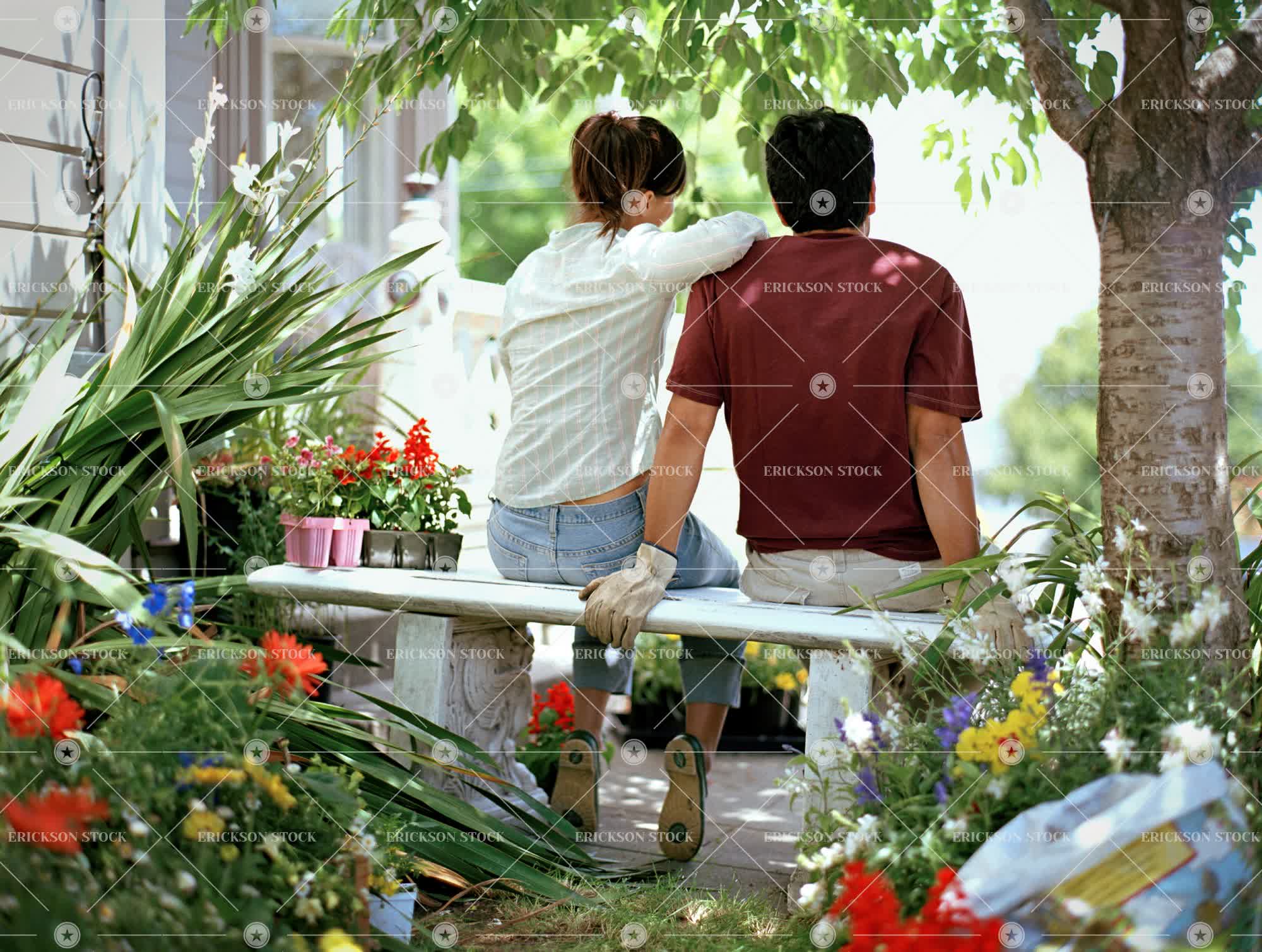 Tags boyfriend, couple, day, domestic, environment, female, flower bed, flowerpot, friend, full length, garden, gardening, girlfriend, heterosexual couple, horizontal, house, Husband, lifestyle, male, man, mid adult, nature, outdoors, people, rear view, Resting, spring, Summer, three quarter length, togetherness, two people, wife, woman, working together, Yard, young adult