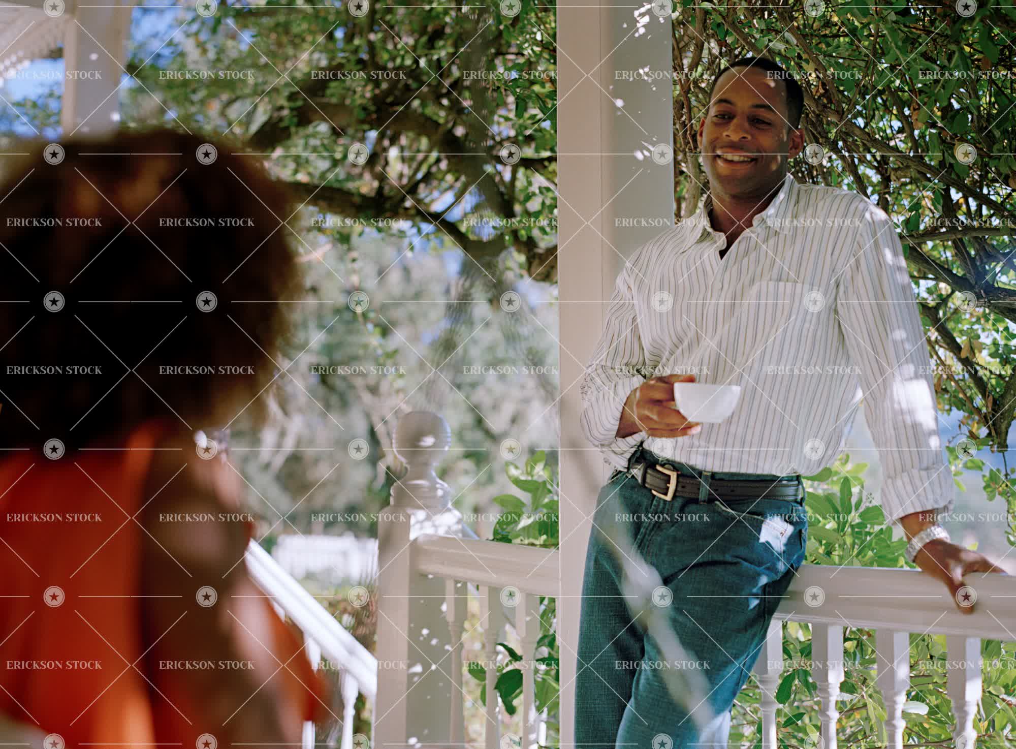 Tags african american, boyfriend, casual, coffee, coffee cup, couple, day, domestic, enjoyment, female, friend, girlfriend, head and shoulders, heterosexual couple, holding, horizontal, Husband, leaning, leisure activity, lifestyle, male, man, mid adult, outdoors, people, porch, railing, Relaxation, smiling, standing, three quarter length, togetherness, two people, wife, woman