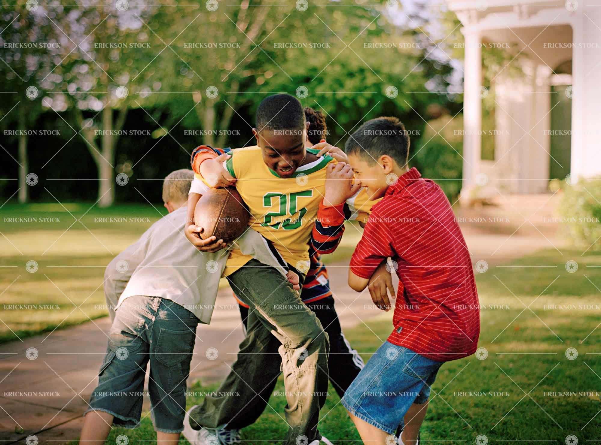 Tags boy, brother, caucasian, child, copy space, day, domestic, Effort, elementary age, energy, enjoyment, family, football, friend, Fun, game, holding, horizontal, house, latin american, lawn, leisure activity, lifestyle, looking down, male, only boys, only children, outdoors, people, Playing, pre-adolescent child, recreation, resistance, Side view, smiling, Sports, standing, tackling, three quarter length, Yard, youth