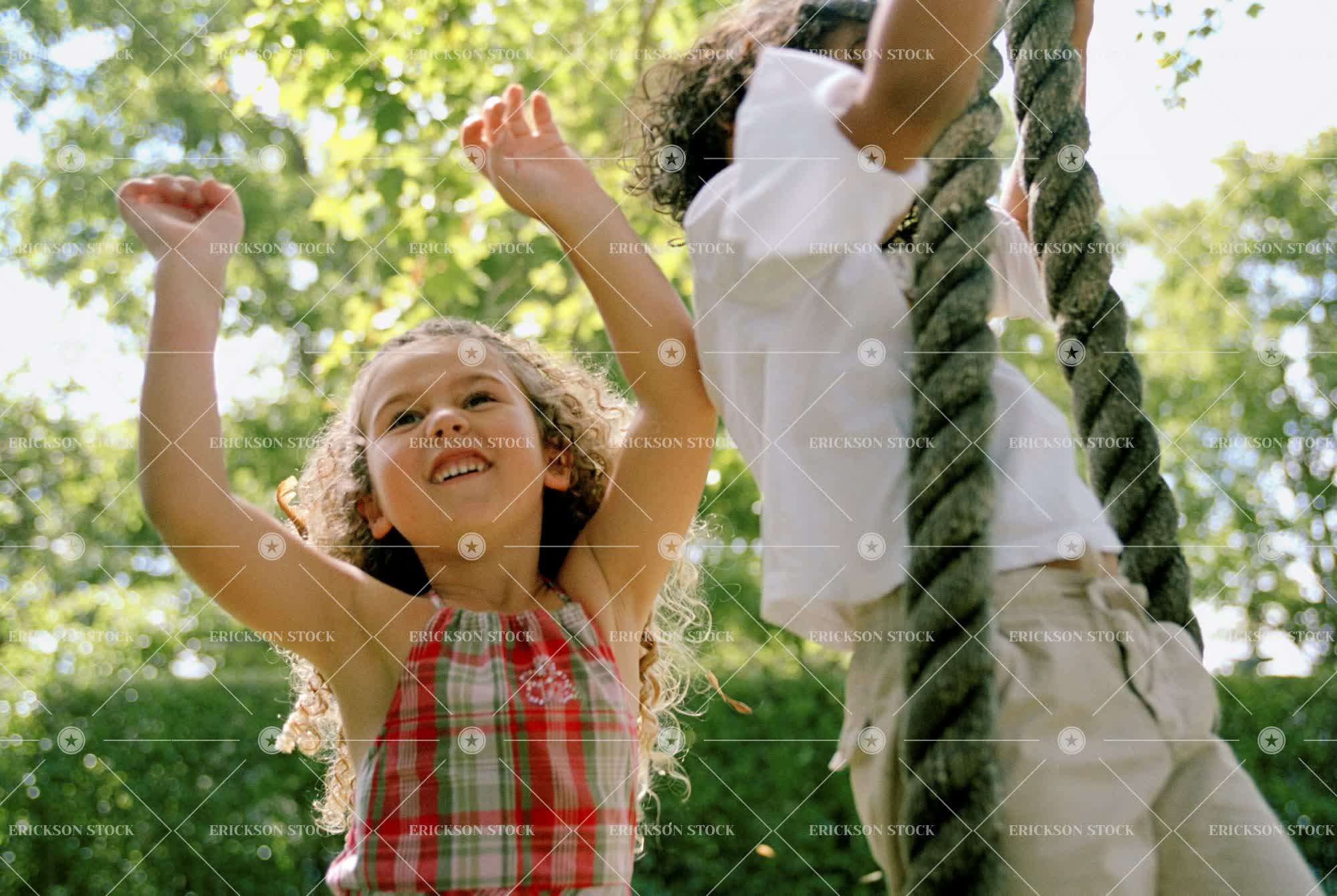 Tags african american, arm raised, carefree, caucasian, child, day, domestic, elementary age, enjoyment, exuberance, friend, front view, Fun, girl, happy, horizontal, kid, kids, latin american, leisure activity, liveliness, looking up, low angle view, only children, only females, only girls, outdoors, people, Playing, recreation, rope, Side view, standing, Swing, three quarter length, two people, waist up