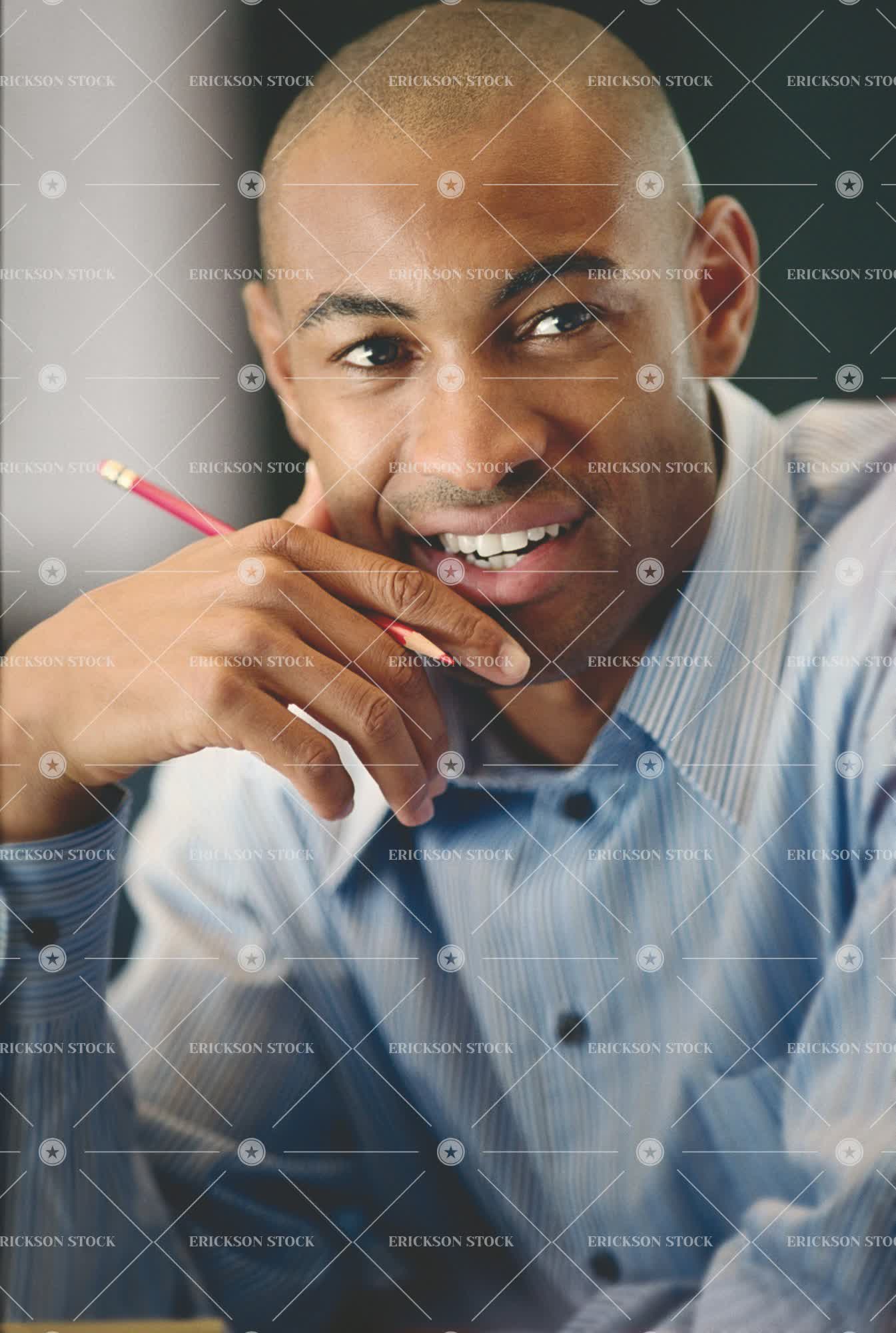 Tags adult, african american, bald, balding, bliss, business, business man, busy, cheerful, close up, confident, delight, edit, edited, editing, editor, editors, edits, enjoyment, enterprise, enterprises, executive, fellow, fellows, front view, gaieties, gaiety, gaily, gay, glad, gladly, gladness, gleeful, gleefully, gleefulness, gratification, gratifications, gratified, gratify, gratifying, gratifys, guy, guys, hairless, hairlessness, happiness, happy, head in hands, held, hold, holding, holds, implement, implements, jollied, jollies, jolly, joy, joyful, joyous, lean, leaned, leaning, leans, leant, lighthearted, lightheartedly, lightheartedness, living, living being, male, man, merriment, merry, object, objects, one person, only males, only men, opportunistic, opportunities, Opportunity, pencil, pencils, people, person, persons, pleased, pleasing, pleasure, rejoice, rejoiced, rejoices, rejoicing, satisfaction, satisfied, satisfies, satisfy, satisfying, smile, smiled, smiles, smiling, thing, toil, toiled, toiling, toils, vertical, vertically, verticals, waist up, work, worked, worker, workers, working, works, writing instrument, writing instruments, young adult