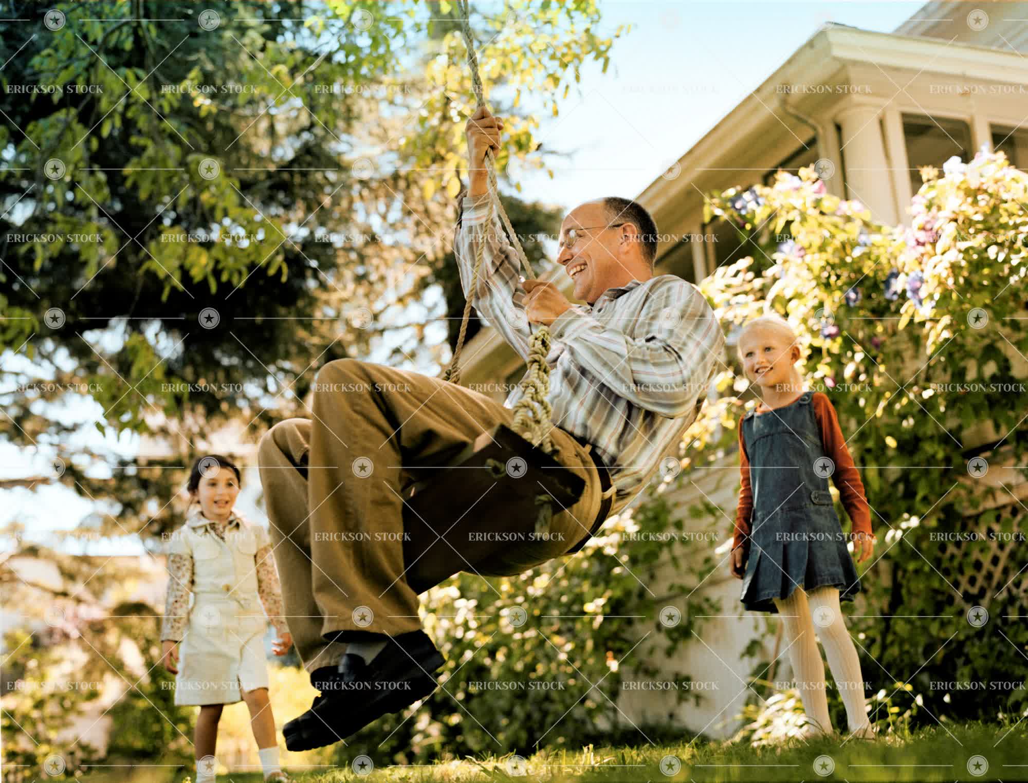 Mature man swinging on tree swing in front of his two daughters in the backyard.