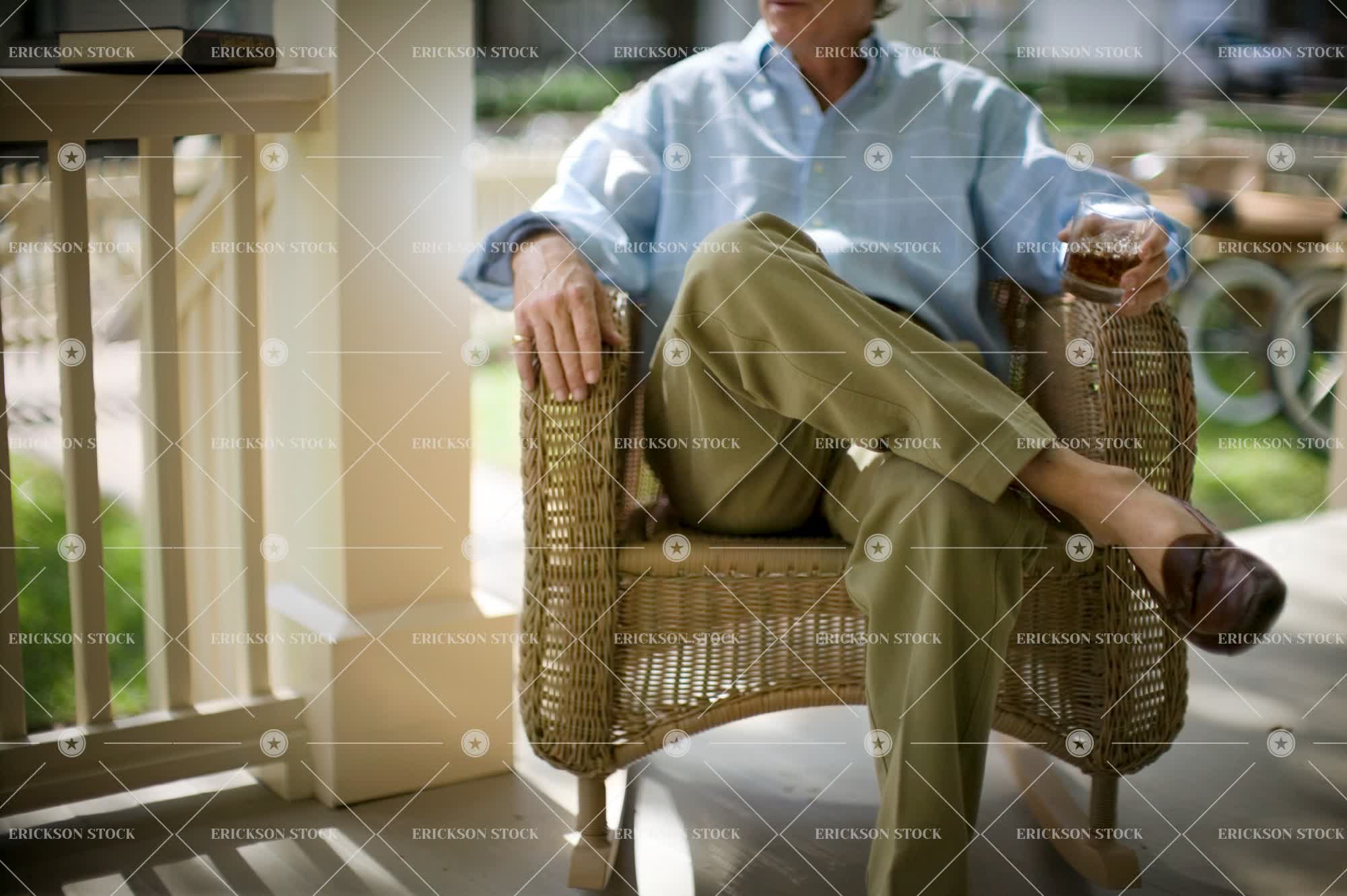Tags book, casual, cocktail, comfort, copy space, day, domestic, glass, holding, horizontal, legs crossed, leisure activity, lifestyle, low section, man, mature adult, one person, only males, only men, outdoors, palmetto, people, porch, Relaxation, rocking chair, sitting, wicker