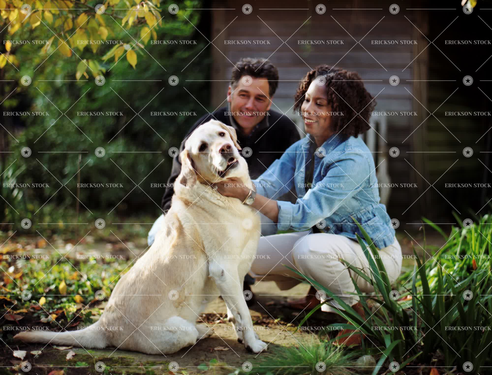 Happy mid-adult couple patting their dog in the back yard of their home.