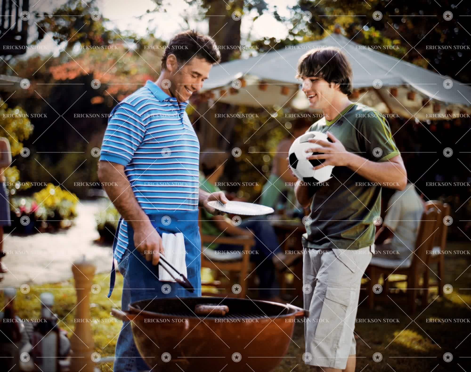Tags adult, apron, backyard, ball, barbecue, boy, caregiver, casual clothes, caucasian, chef, conversation, cook, day, dinner party, family, father, flip, flipper, focus on foreground, Food, garden, gardens, grass, grill, grills, hamburger, happiness, happy, having fun, hold, holding, horizontal, lawn, lawns, male, man, mature adult, mid adult, outdoor, outdoors, outside, parent, parents, parties, party, people, pepper, plate, plates, polo shirt, polo shirts, sauce, smile, smiles, smiling, soccer, soccer ball, soccer balls, soccerball, soccerballs, son, spatula, speak, speaking, special occasion, stand, standing, stereotypical, suburbia, summer evening, talk, talking, teenage boy, teenager, three quarter length, together, togetherness, tong, tongs, two people, young adult