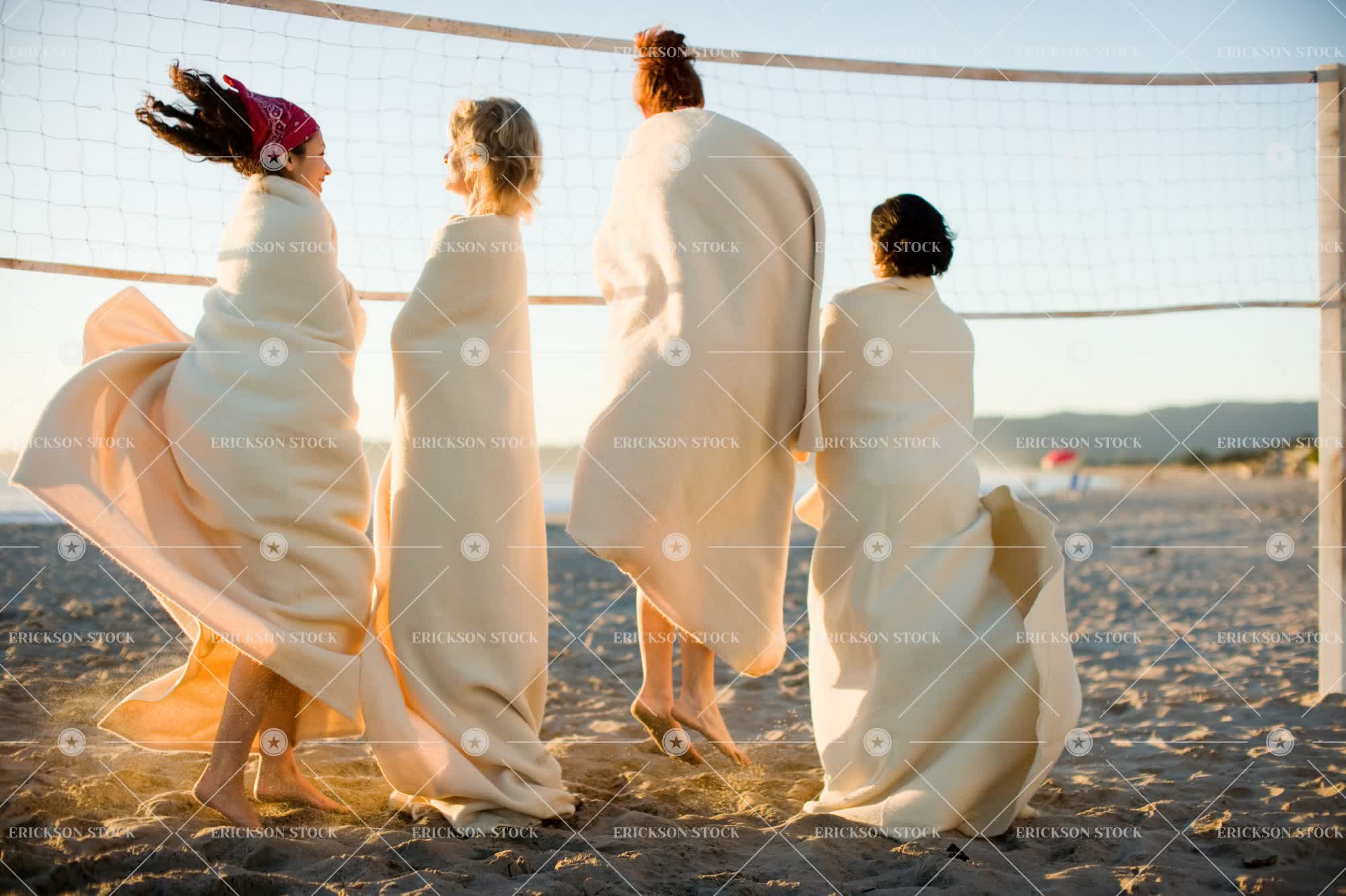 Group of females jumping around in blankets by a volleyball net on the beach at sunset.