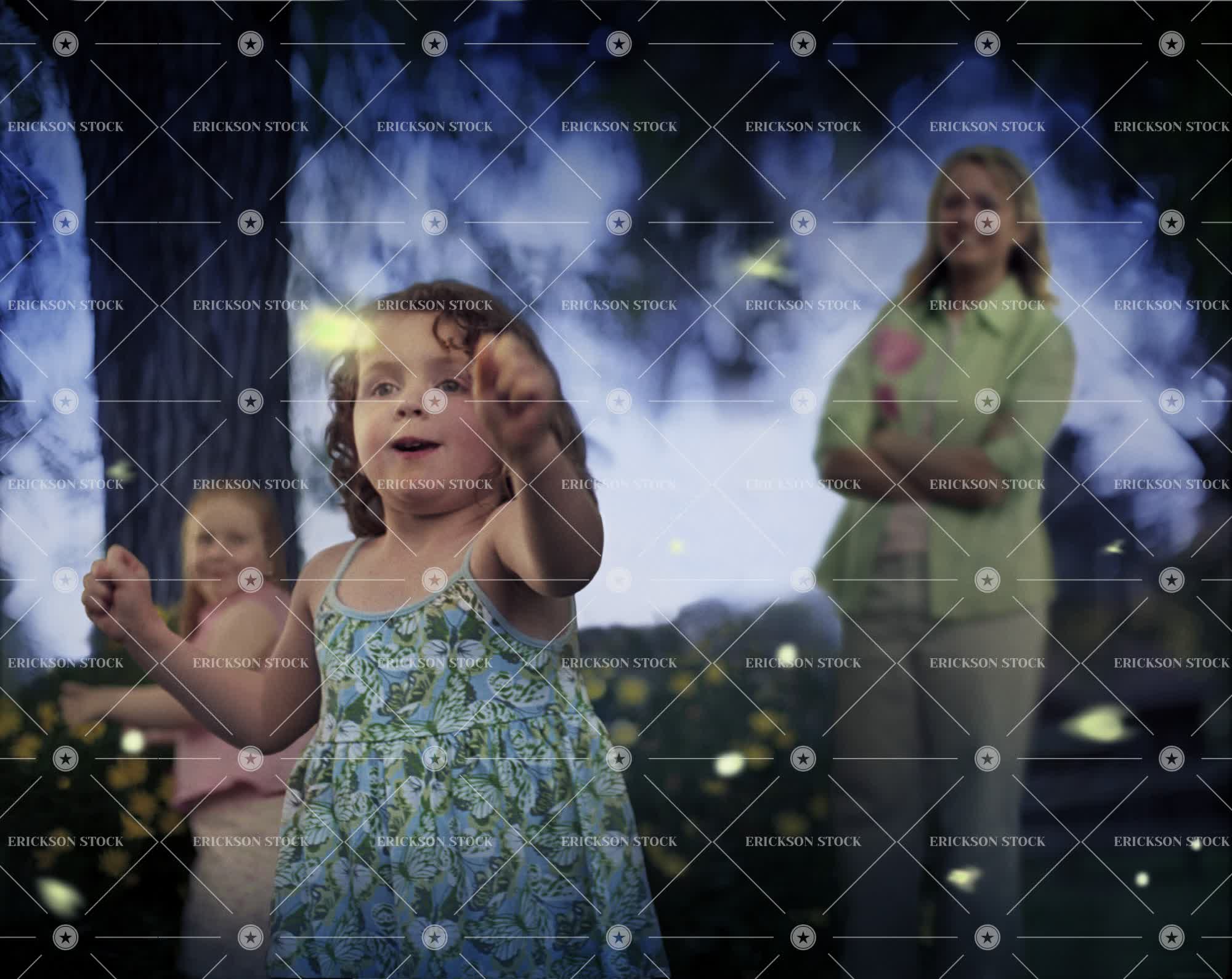 Mesmerized young girl following fireflies in the garden with her mother and sister at dusk.