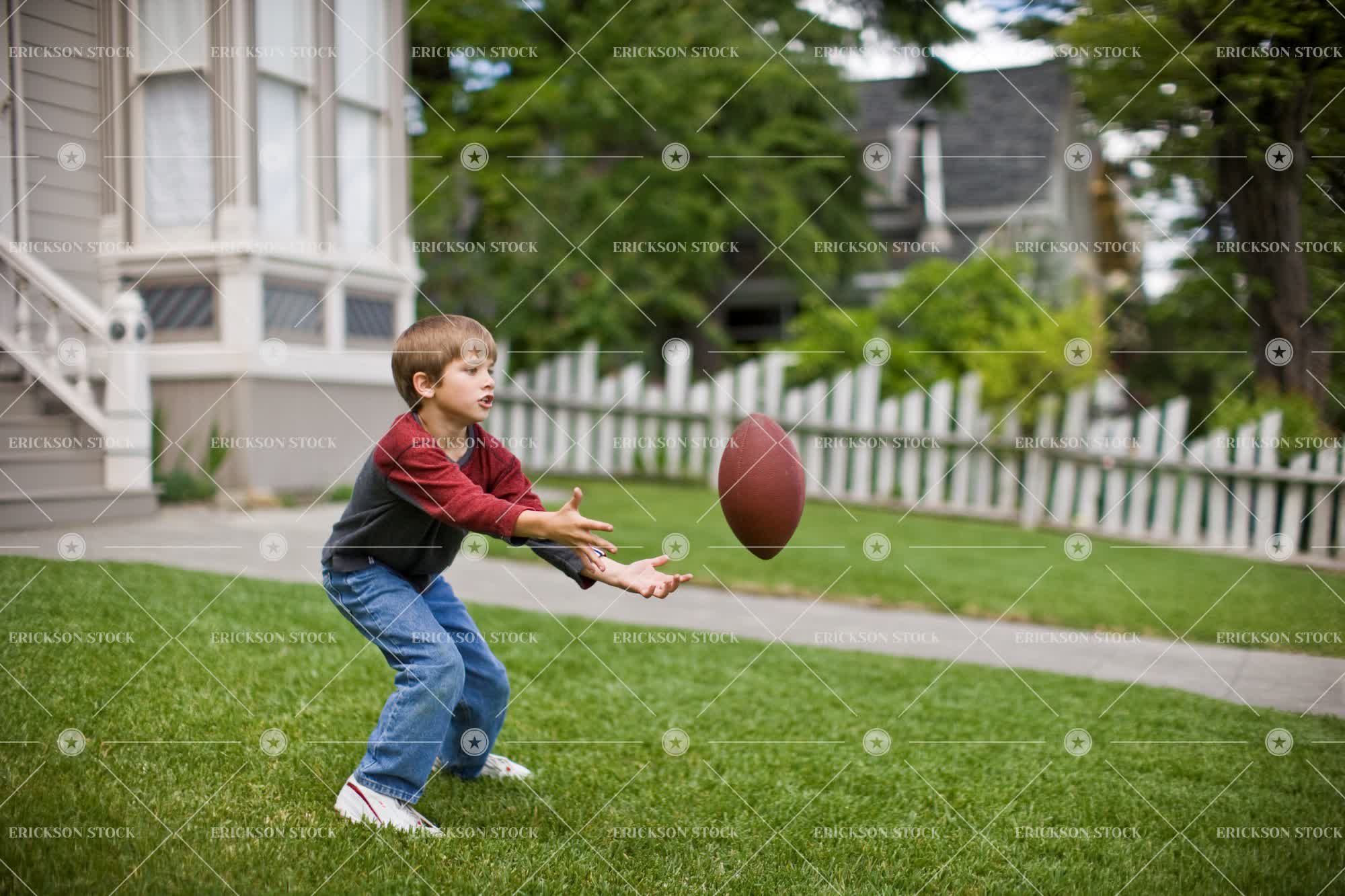 Young boy crouching to catch a football in the front yard of his home.