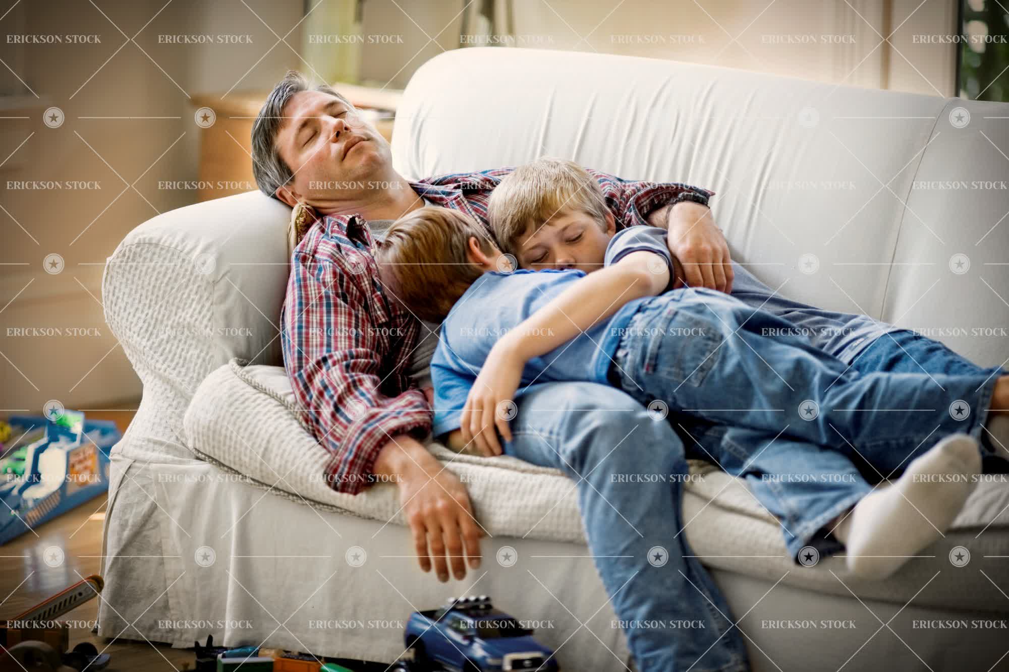 Mid-adult man asleep with his two sons on a sofa inside their home.
