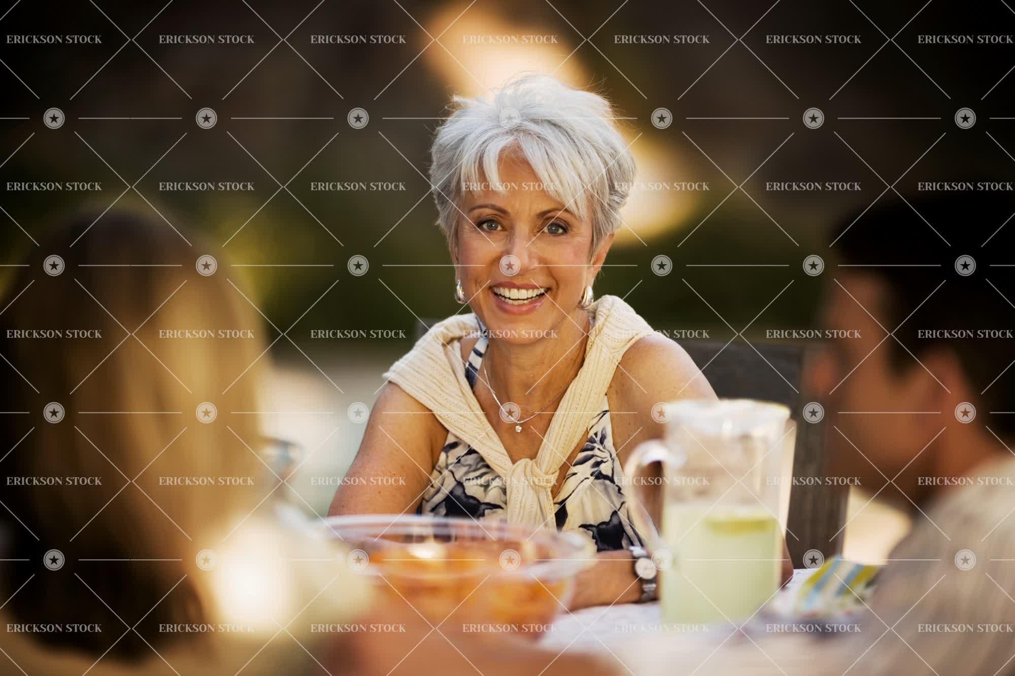 Portrait of a mature woman sitting with friends while having drinks outside.