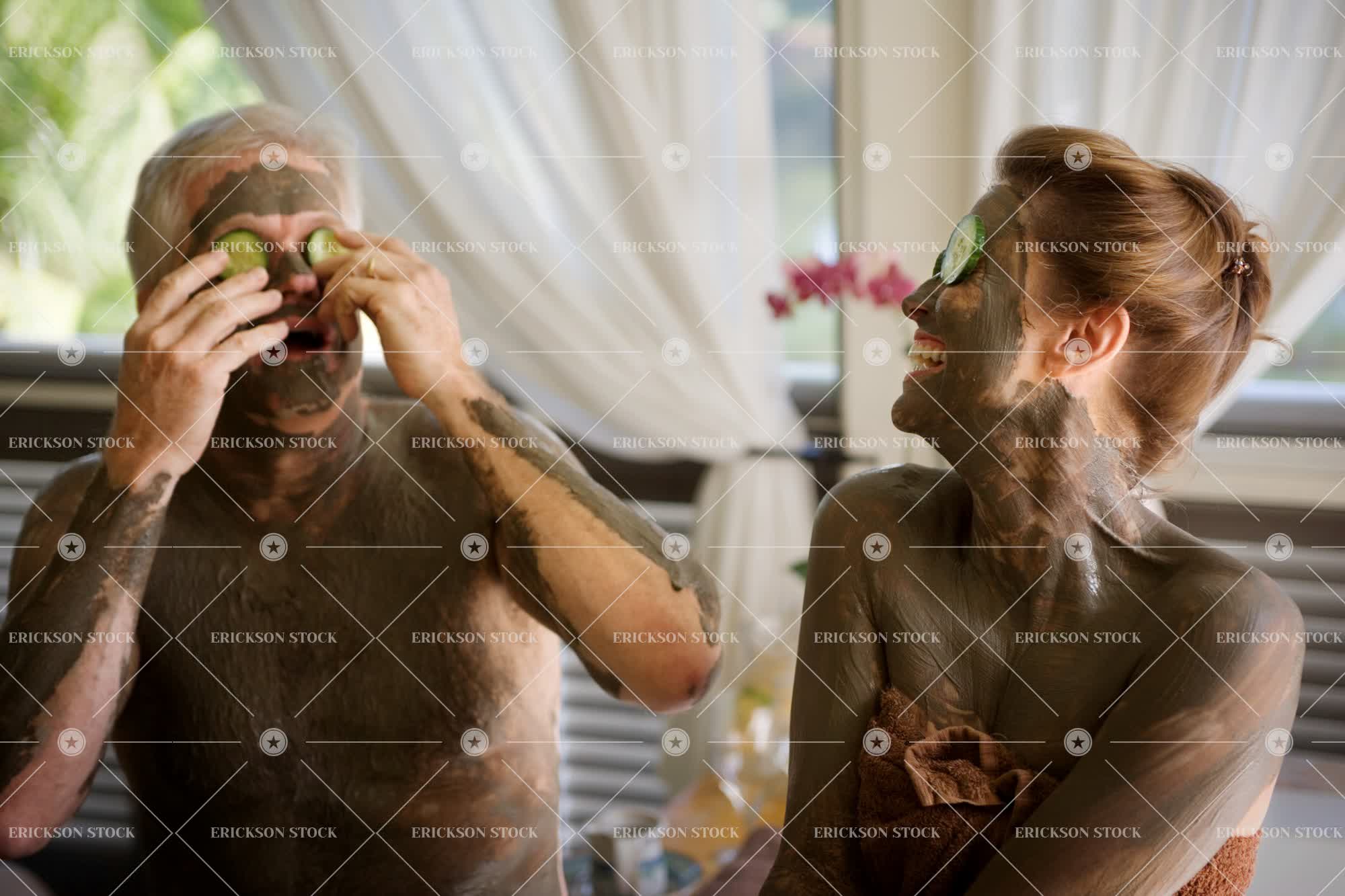 Mature adult couple wearing towels and covered in mud while applying cucumber slices.