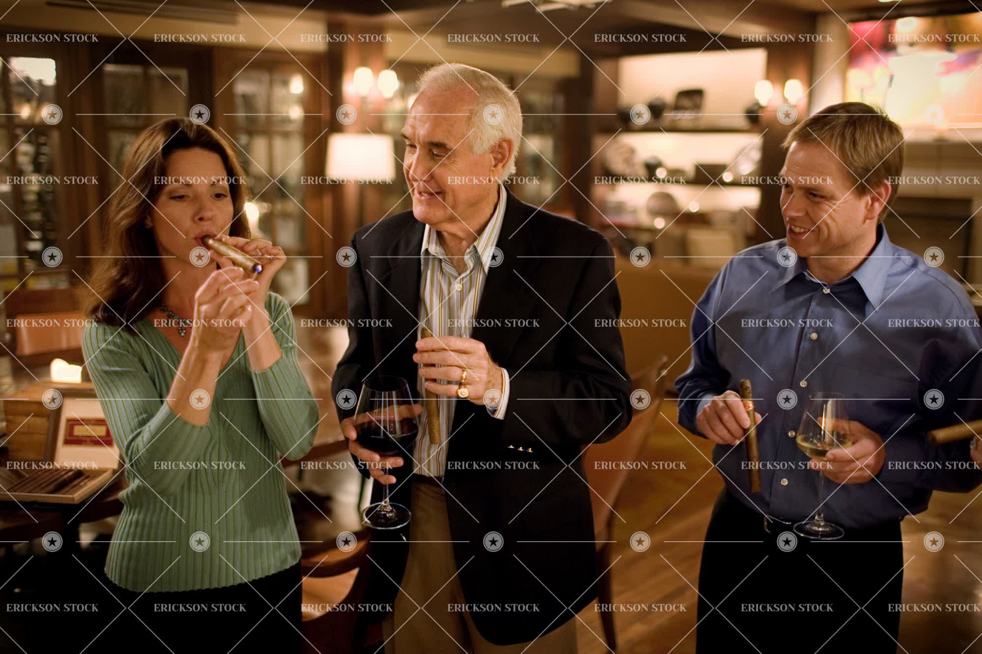woman lights a cigar while two men look on