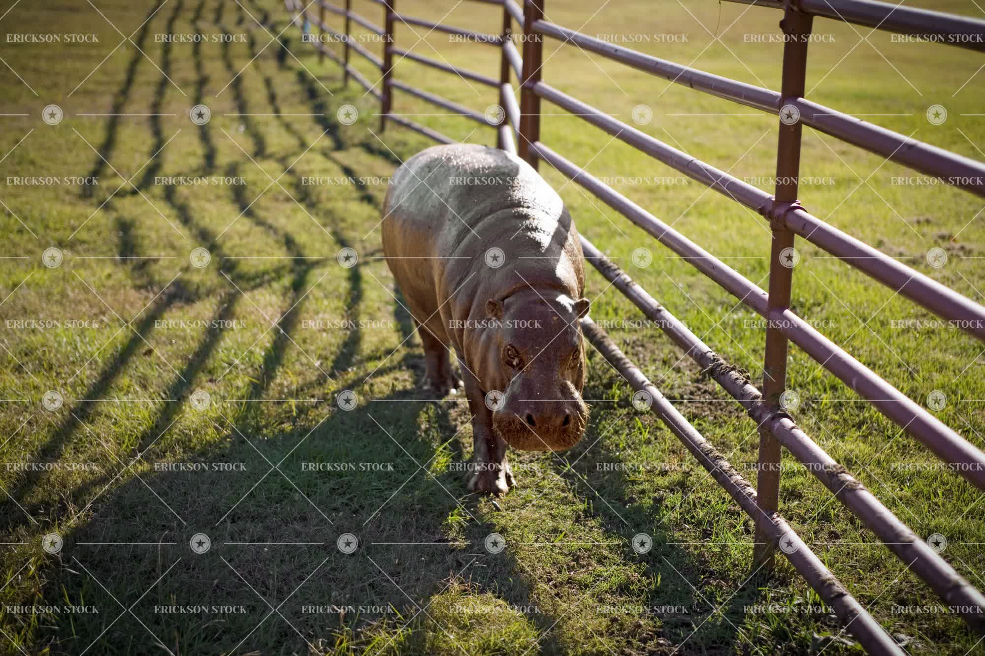 Tags animal, copy space, day, Fence, hippopotamus, horizontal, looking at camera, nobody, one animal, outdoors, palmetto, pasture, standing, three quarter length, Walking, wildlife