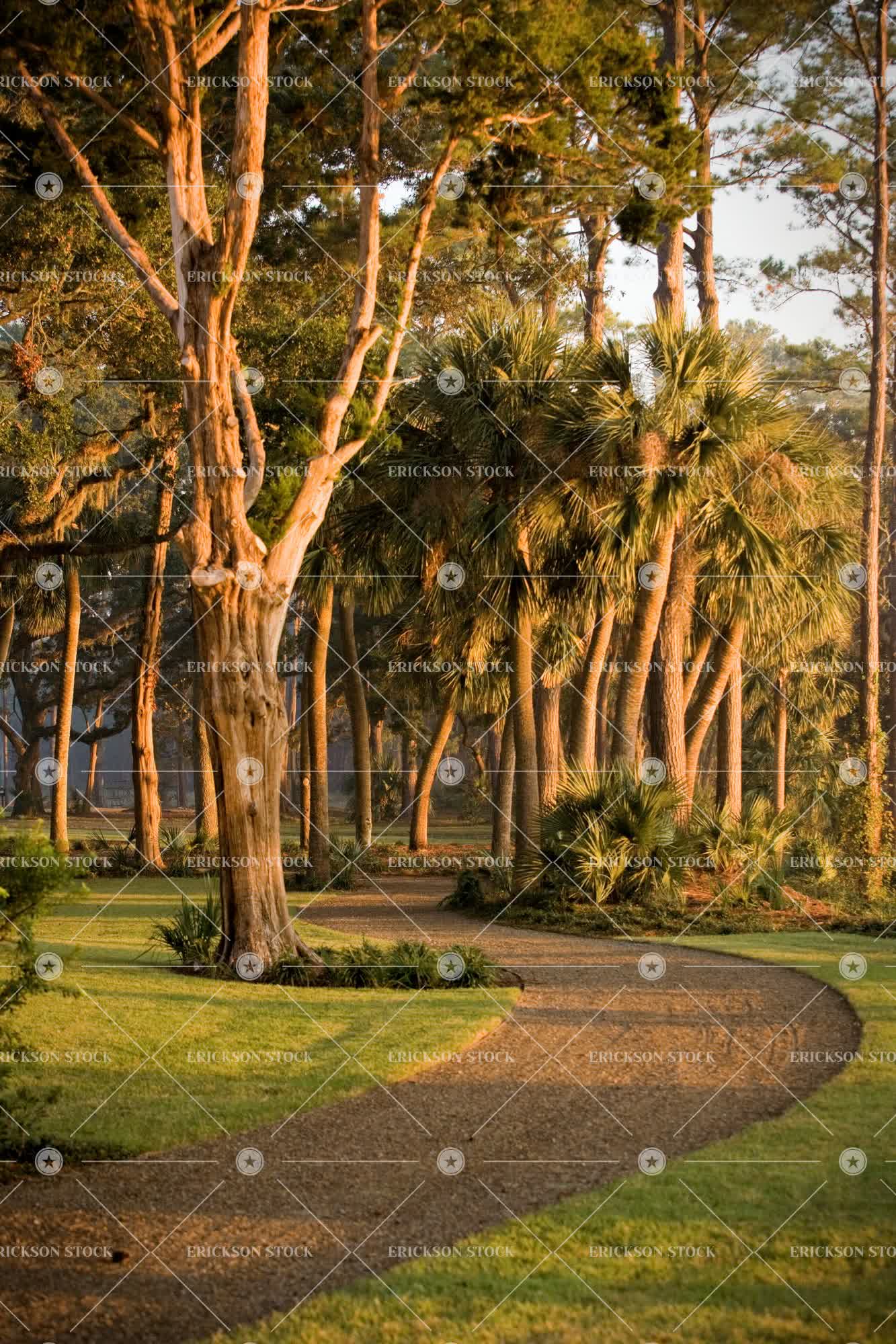 Gravel path through trees and a garden at sunrise.