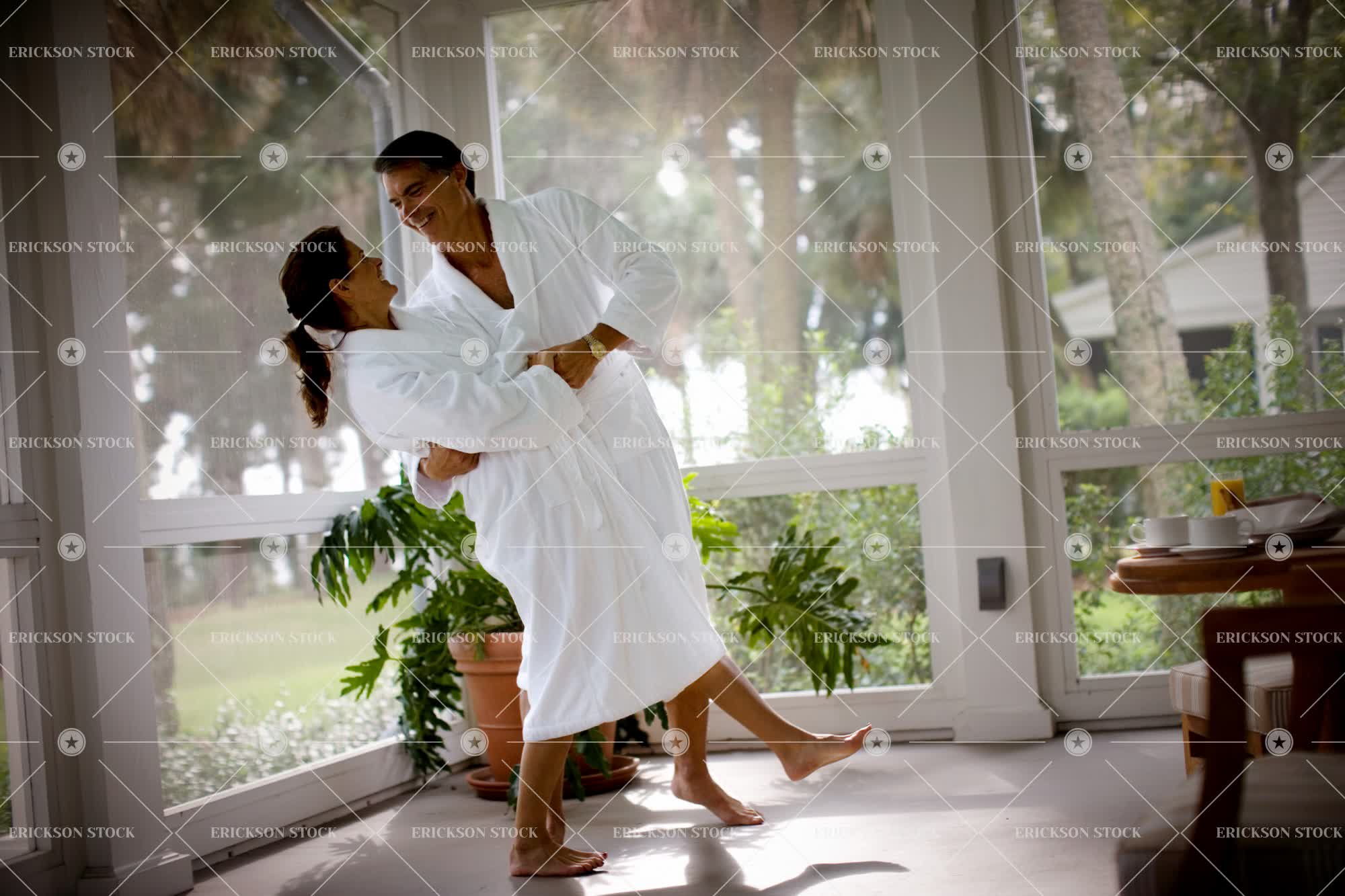 Tags barefoot, bathrobe, boyfriend, caucasian, chair, couple, cup, dance, day, dip, enjoyment, female, Food and drink, friend, full length, girlfriend, glass, happy, heterosexual couple, holding, horizontal, hugging, Husband, indoors, juice, leisure activity, livingroom, male, man, mature adult, mid adult, orange, palmetto, people, porch, profile, robe, saucer, Side view, smiling, standing, table, together, two people, wife, window, woman