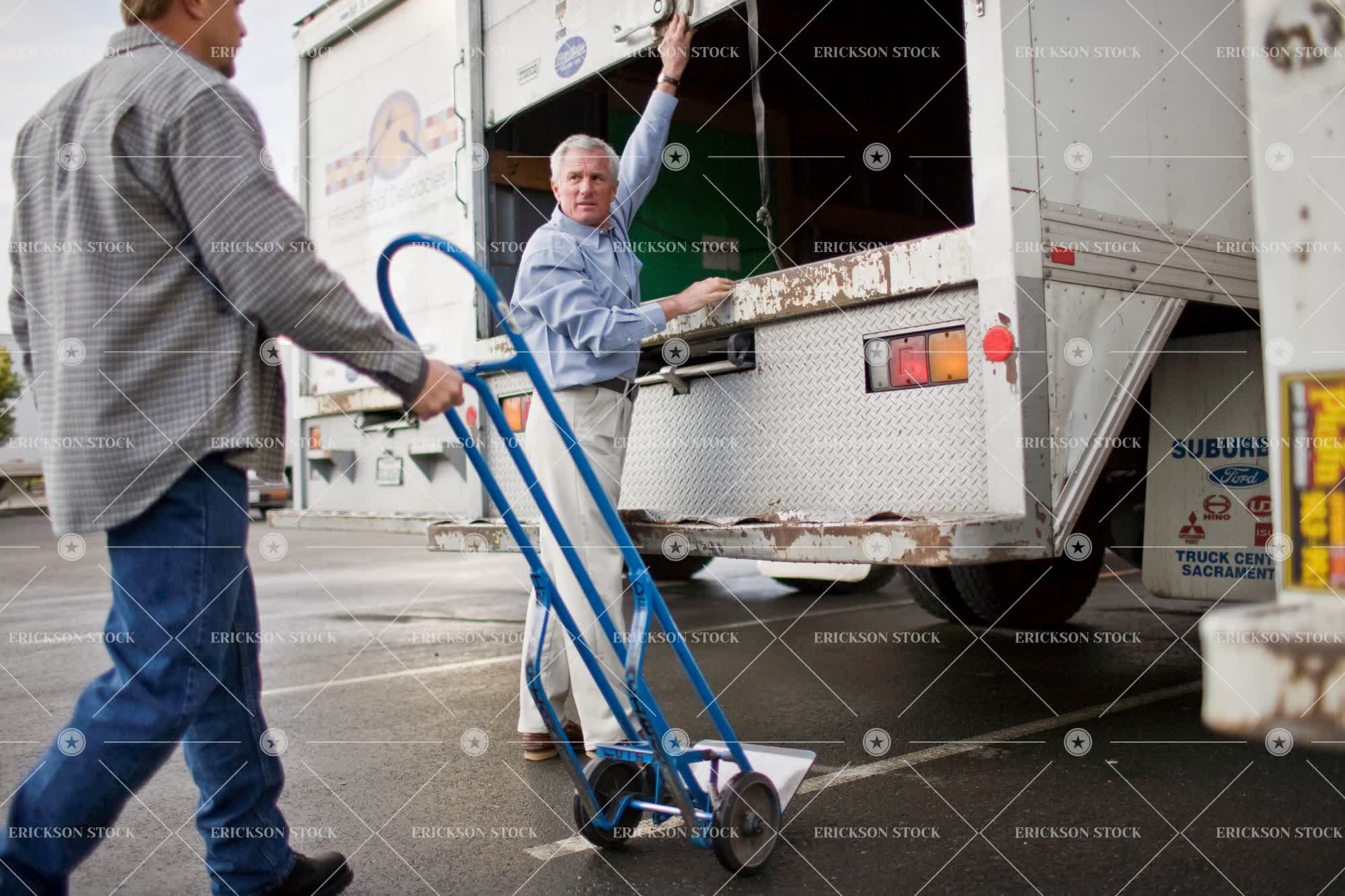 Tags adult, at work, boss, button down shirt, caucasian, cheerful, closing, collared shirt, day, friendly, full length, horizontal, lorries, lorry, male, males only, man, manager, managers, mature adult, men only, mid adult, occupation, occupations, only males, only men, outdoor, outdoors, outside, people, place of work, Pulling, pushing, reach, Reaching, roller door, roller doors, selective focus, shipping, shirt, shirts, shutting, stand, standing, supervisor, supervisors, transporting, trolley, trollies, truck, trucker, truckers, trucking, trucking industry, trucks, two people, unrecognizable people, unrecognizable person, work, working, workplace