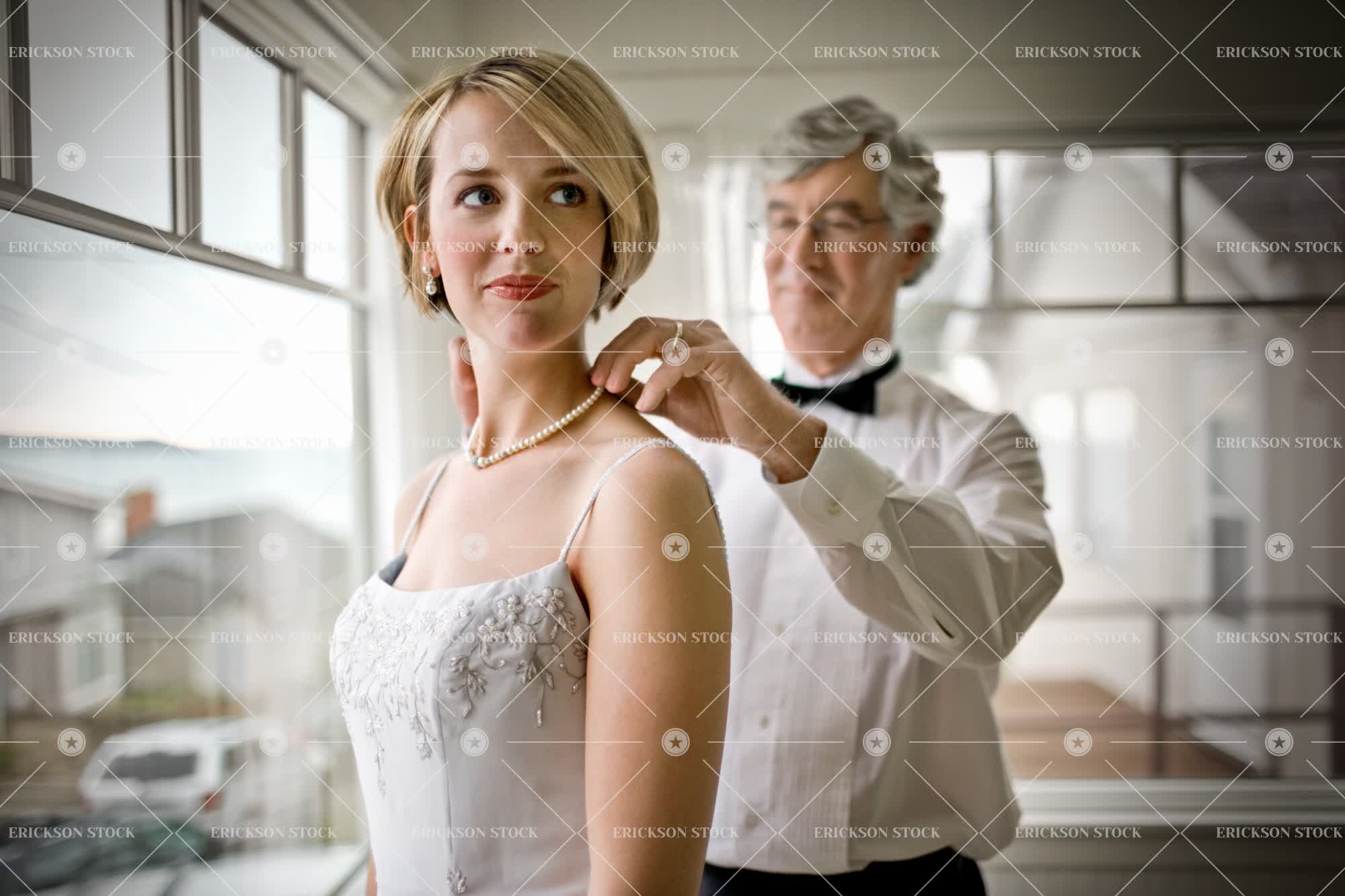 Tags adult, adult offspring, assist, bride, caucasian, celebrate, daughter, day, dress, family, fasten, fastening, father, father of the bride, female, half length, happiness, happy, help, helping, indoor, indoors, inside, love, loving, male, man, mature adult, mid adult, necklace, necklaces, parent, parents, pearl necklace, pearl necklaces, person, put on, putting on, selective focus, senior adult, two people, waist up, wedding, wedding dress, wedding dresses, weddings, woman, young adult