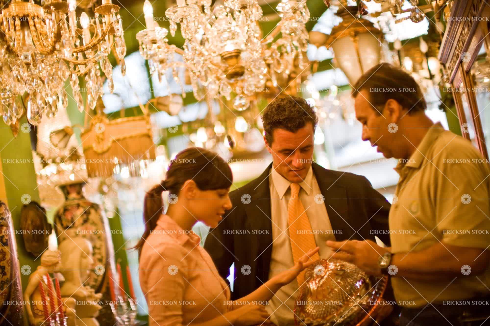 Mid-adult couple looking at ornaments inside an antique store with the help of a sales assistant.