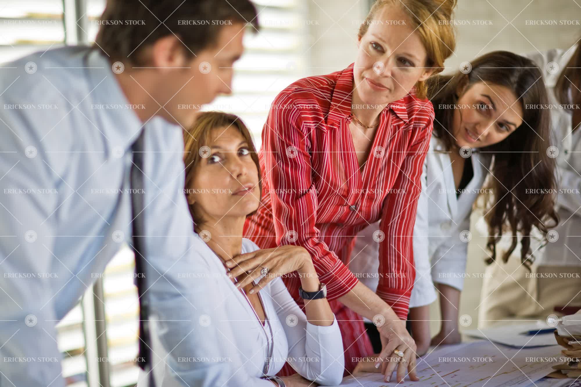 Three mid-adult business women listening to a male colleague at a desk in an office.