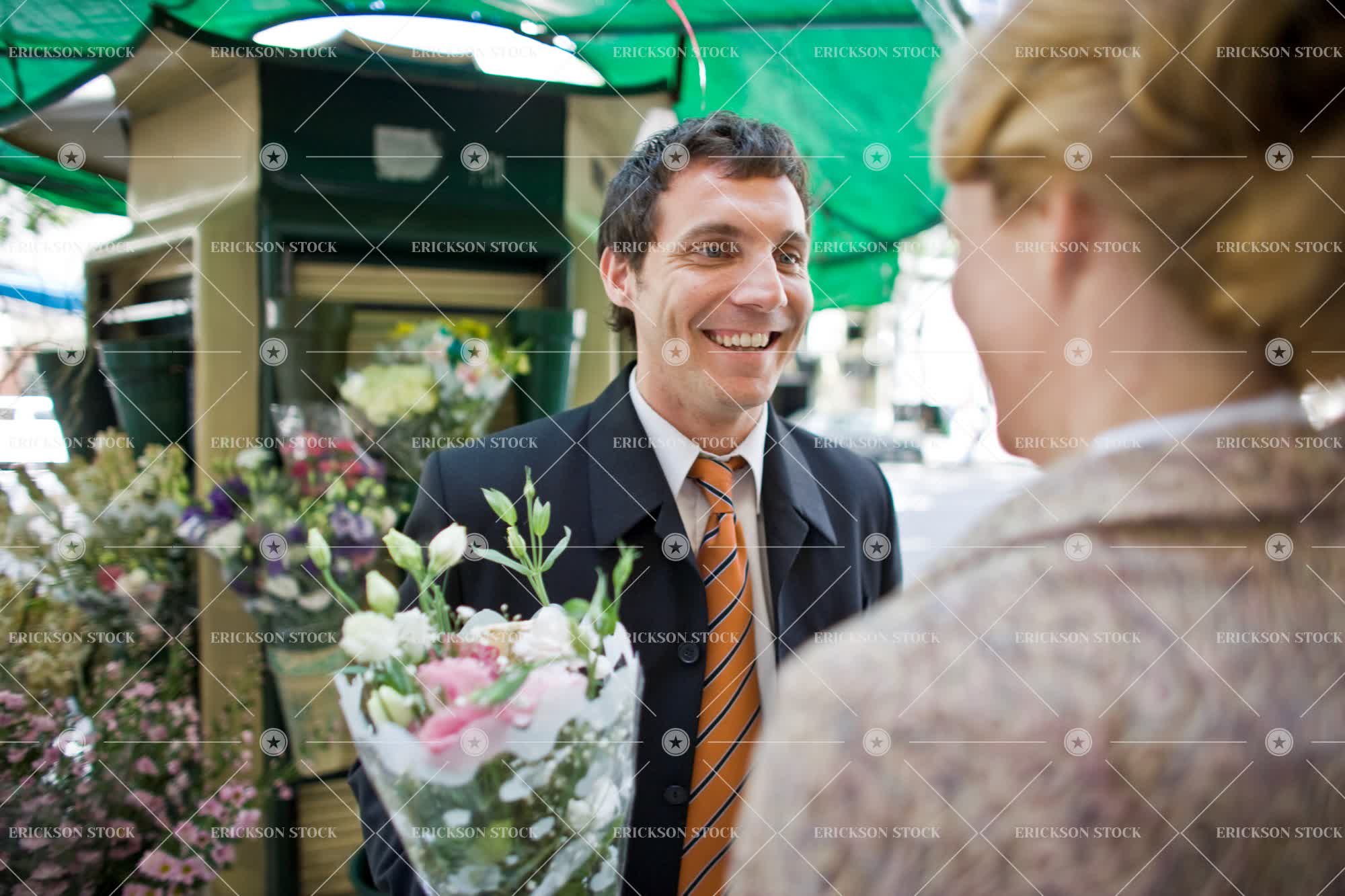 Tags adult, arrangement, bouquet, bunch, city, couple, day, female, flower, flower arrangement, flower arrangements, flowers, formal, formal wear, formalwear, front view, half length, happiness, happy, heterosexual couple, heterosexual couples, horizontal, look at each other, looking at each other, male, man, mid adult, outdoor, outdoors, outside, over the shoulder, over the shoulder view, partner, people, relationship, relationships, romance, romantic, selective focus, smile, smiles, smiling, stall, stalls, stand, standing, stands, street scene, street scenes, streetscape, streetscapes, two people, urban, urban scene, Urban scenes, waist up, well-dressed, woman, young adult