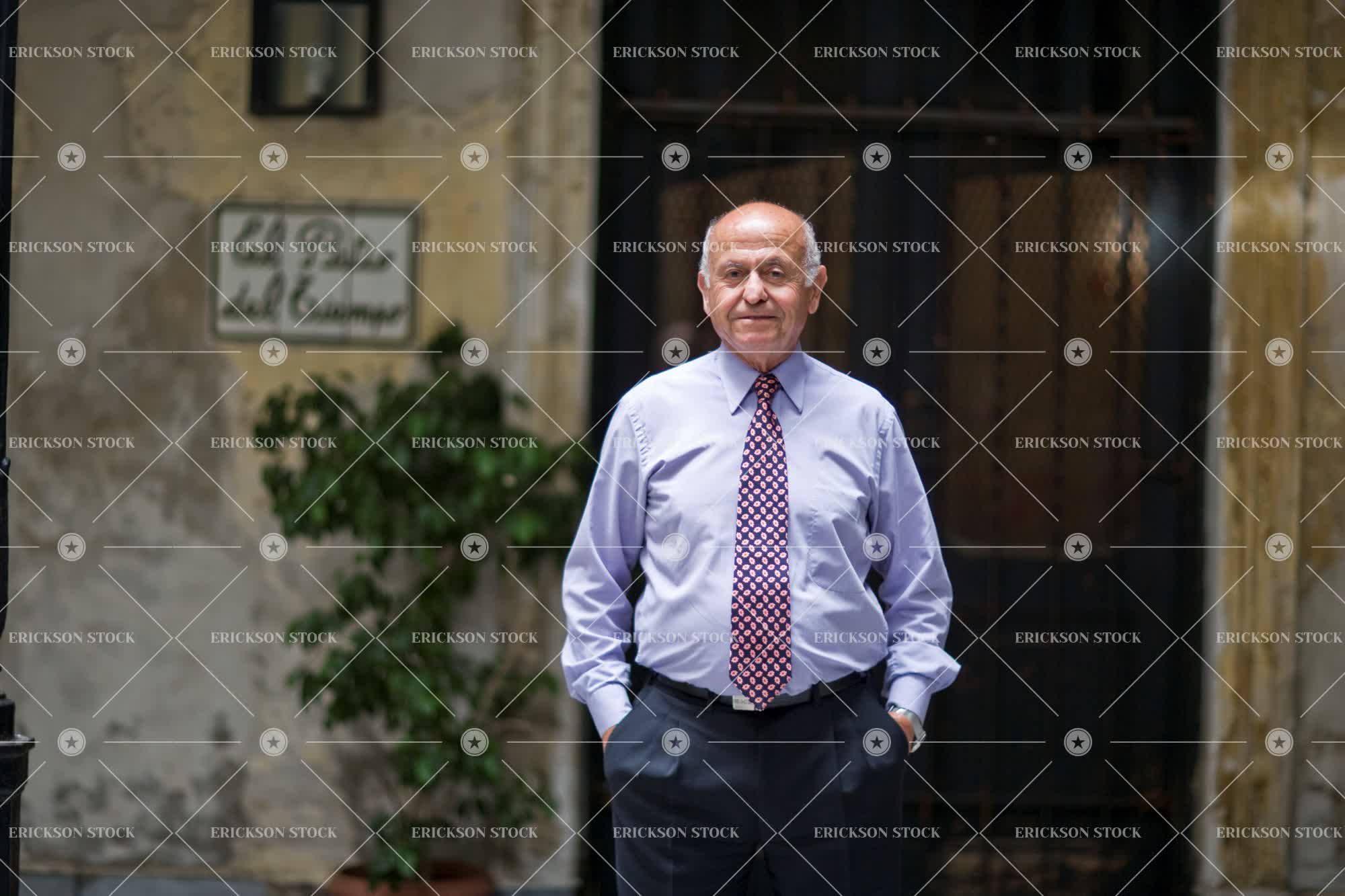 Tags adult, bald, balding, city, courtyard, day, door, doorway, entrance, entry, entryway, entryways, Eye contact, focus on foreground, frame, front view, hand in pocket, hands in pockets, horizontal, look at camera, looking at camera, male, man, mature adult, mid adult, one person, outdoor, outdoors, outside, people, person, portrait, Portraits, receding, receding hair, receding hairline, selective focus, senior adult, shirt and tie, shirts and ties, smile, smiles, smiling, stand, standing, three quarter length, urban, urban scene, Urban scenes