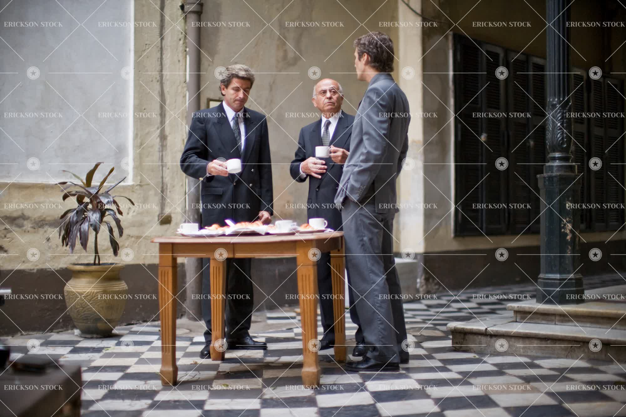 Senior business man drinking coffee with two mid-adult male colleagues in a courtyard.