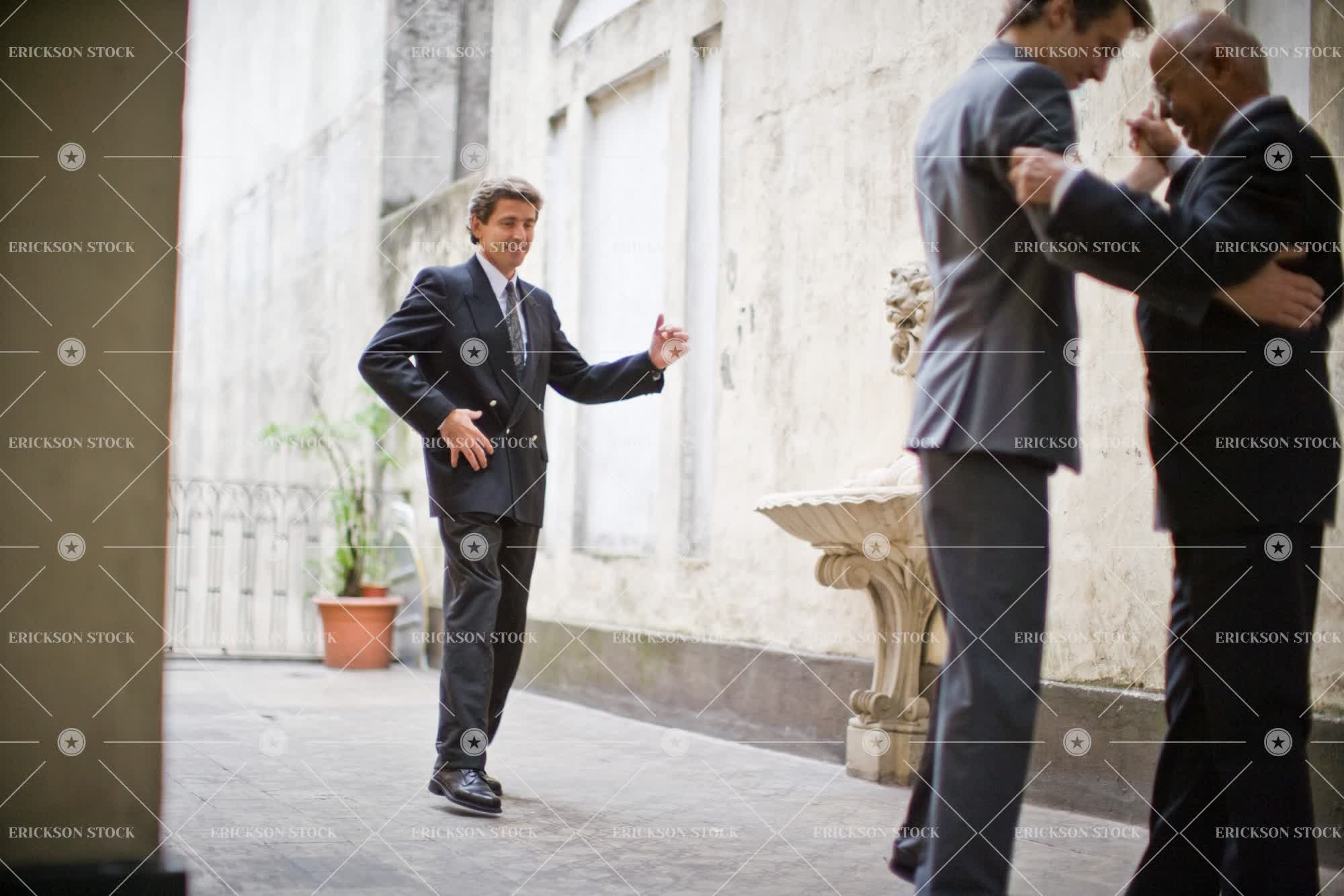 Senior business man teaching a mid-adult male colleague to dance while another male co-worker follows in a courtyard.