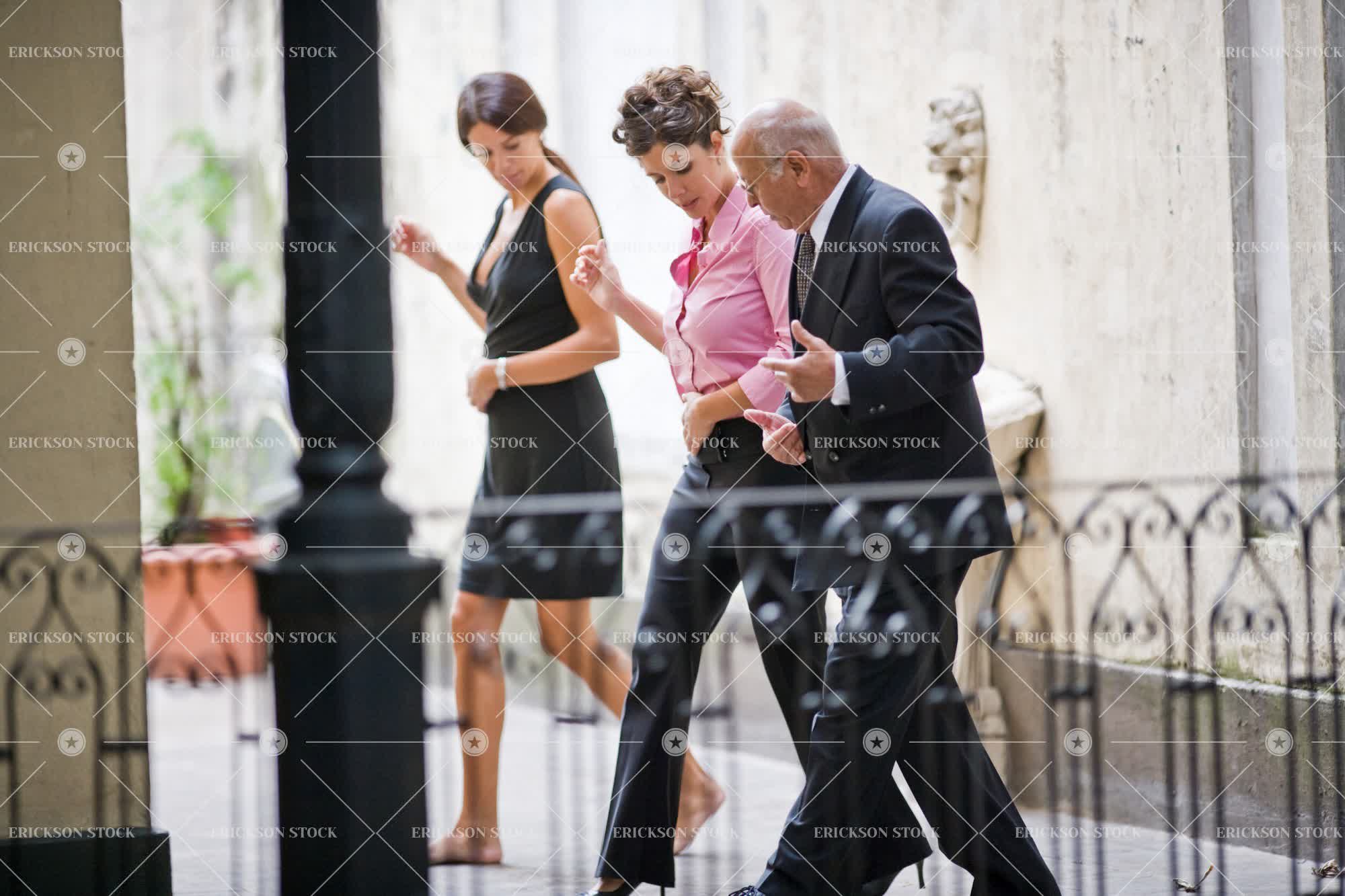Two mid-adult business woman learning a dance from a senior male colleague in a balcony.