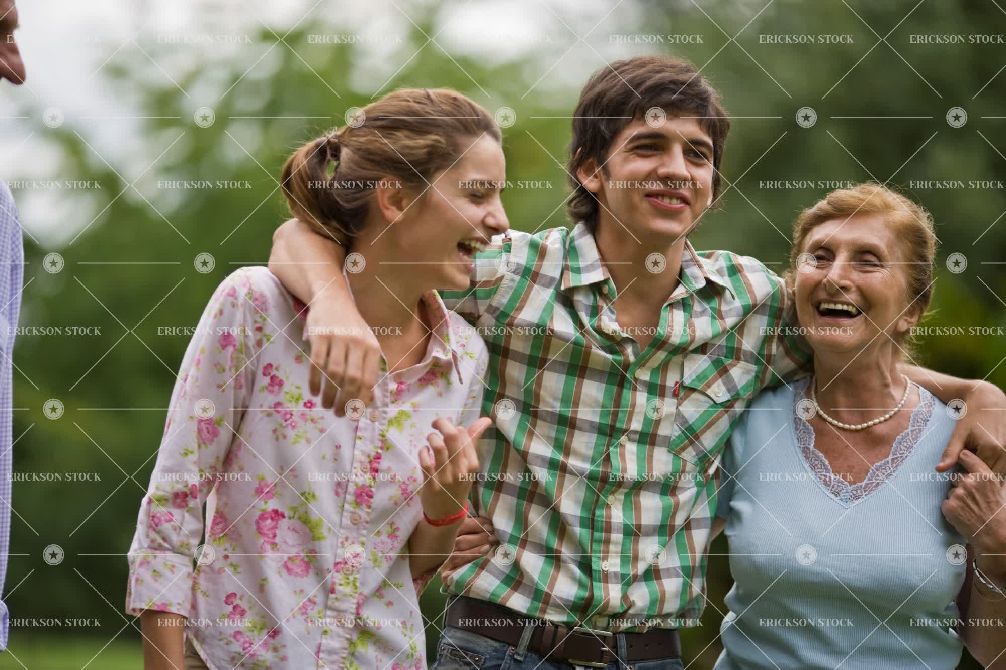 Happy teenage boy hugging his mature grandmother and teenage sister while outside in the garden.