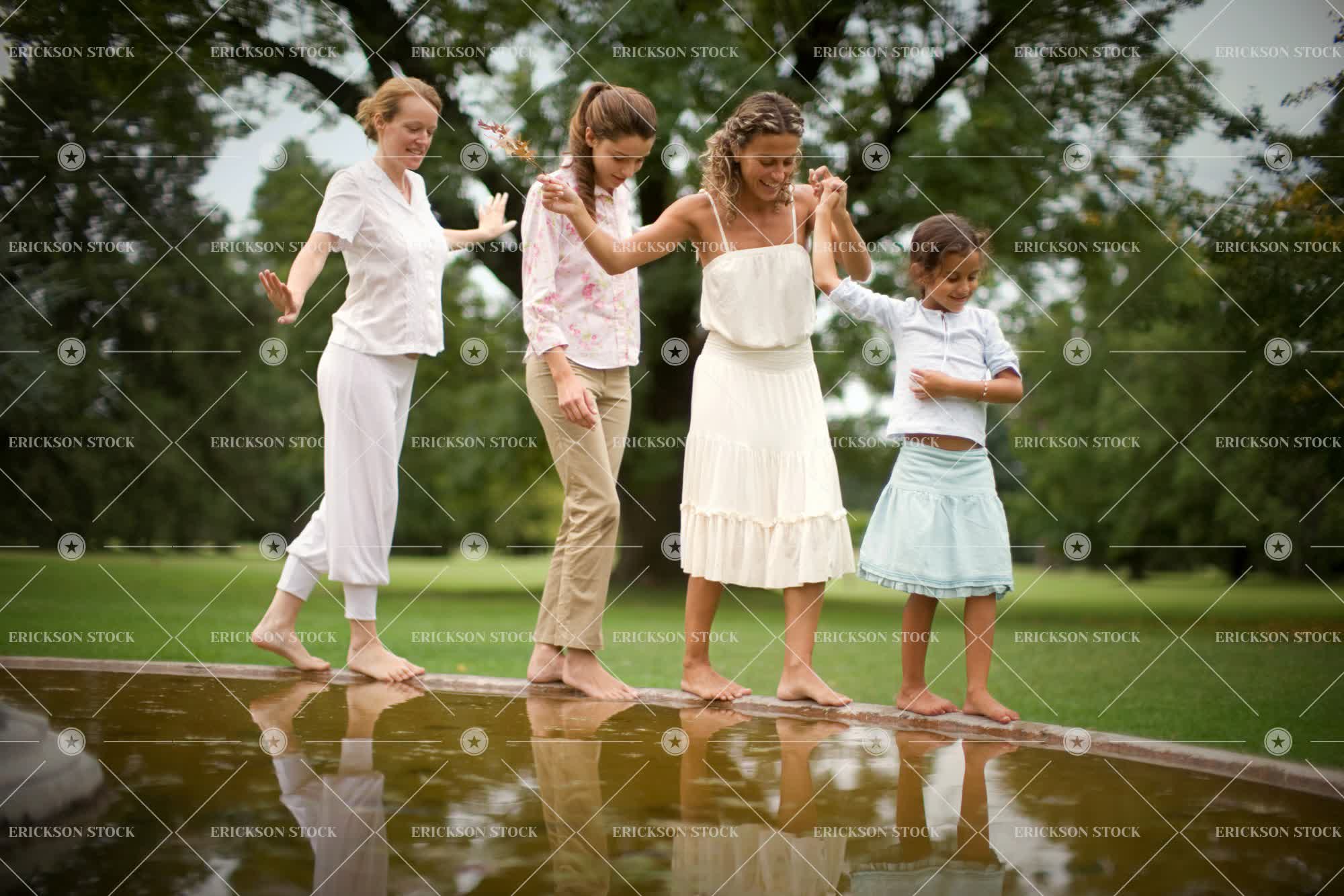 Side view of four females balancing on the brim of a fountain.