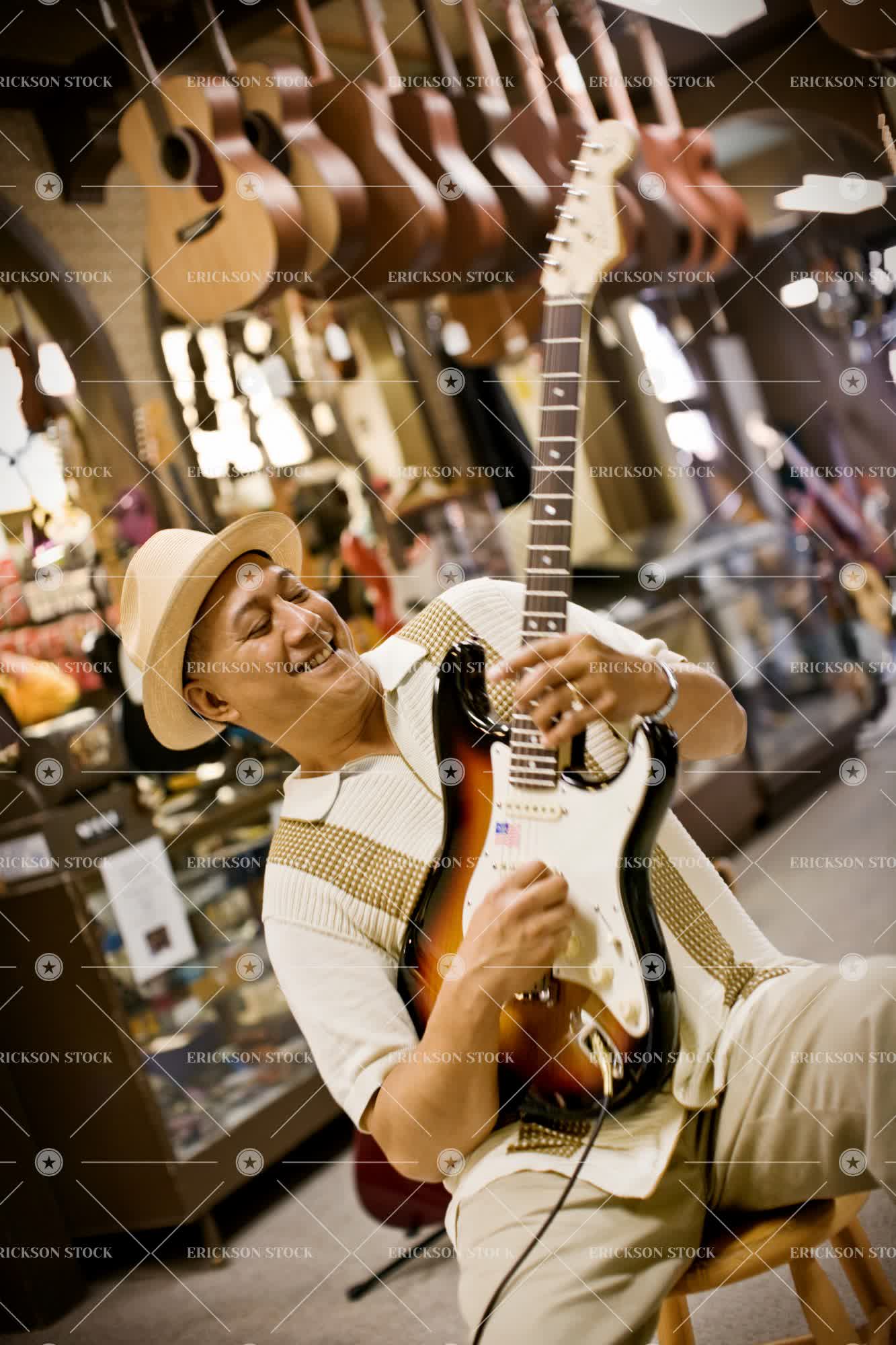 Tags abundance, adult, amplifier, axe, blues, blur, brim, buy, canted angle, casual clothes, cheerful, day, enjoyment, entertainer, fedora hat, fedora hats, fender, fender strat, fender stratocaster, groove, group, groups, Guitar, guitar shop, guitar shops, guitar store, Guitarist, guitarists, guitars, happiness, happy, hat, hats, in a row, indoor, indoors, inside, jam, large group of objects, latin american, lick, licks, loudness, male, man, many, mature adult, melodious, melody, mid adult, motion, Motion blur, multitude, Music, music shop, music shops, music store, music stores, musical, Musical instrument, musical instruments, Musician, musicians, noise, noisy, oblique angle, one person, passion, people, performance, performances, performer, performers, person, pickup, pickups, play, Playing, r&b, retail, riff, rock, rock music, row, selling, shop, shops, sit, sits, sitting, smile, smiles, smiling, sound, store, stores, testing, three quarter length, tilt, tilted angle, vertical, vignette, virtuosi, virtuoso, volume