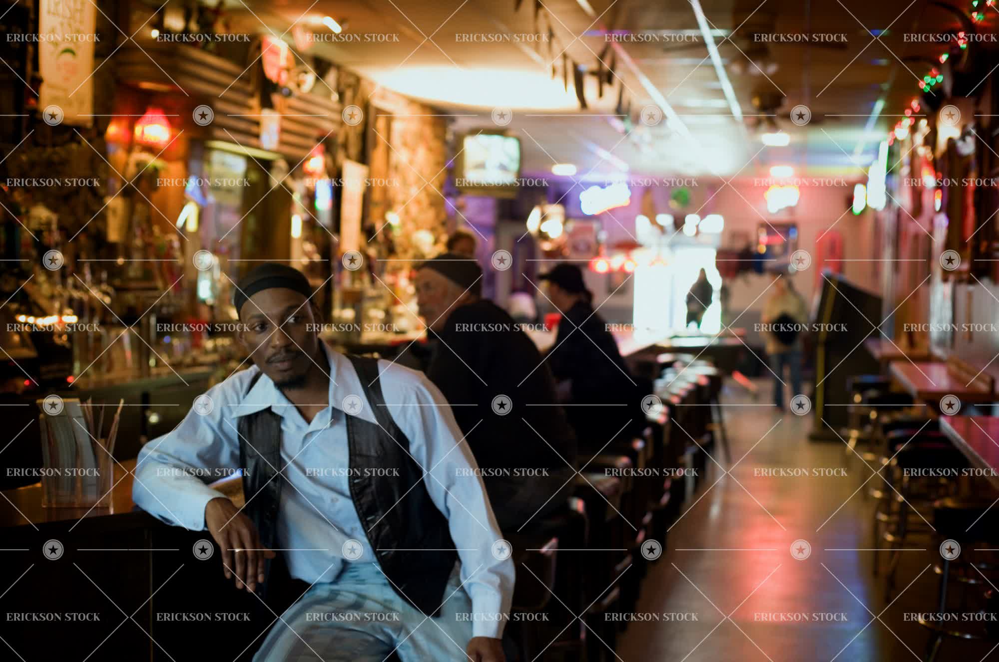 Tags adult, advertisement, african american, alcohol, alcoholic beverage, background people, bar, bartender, cap, casual, club, cocktail, consider, contemplate, counter, dark, dive, easygoing, empty, entertainment, entertainments, evening, evenings, fashion, fashions, fellow, fellows, female, Food, Food and drink, foods, free time, front view, front views, Fun, funky, group, groups, guy, guys, hang out, hanging out, hard liquor, horizontal, horizontally, horizontals, indoor, indoors, informal, inside, juke box, lean, leaned, leaning, leans, leant, leisure, leisure activities, leisure activity, leisure time, leisurely, lifestyle, lifestyles, male, man, medium group of people, mid adult, mingle, mingled, mingles, mingling, muse, night, nightclub, nightfall, nightlife, nights, nighttime, nite, nites, occupation, occupations, of african descent, only males, only men, pastime, pastimes, pensive, pensively, pensiveness, people, person, persons, preoccupation, preoccupations, preoccupied, profile, profiles, pub, pubs, relax, reputation, saloon, saloons, sat, seat, seated, seating, seats, serious, seriously, seriousness, service, Side view, side views, sit, sits, sitting, societies, society, solemn, solemnly, somber, taproom, taprooms, thinking, three quarter length, toiling, toils, trend, trends, tunes, vest, vests, western european, wistful, wistfully, woman, worked, working, works, worktop, worktops, young adult
