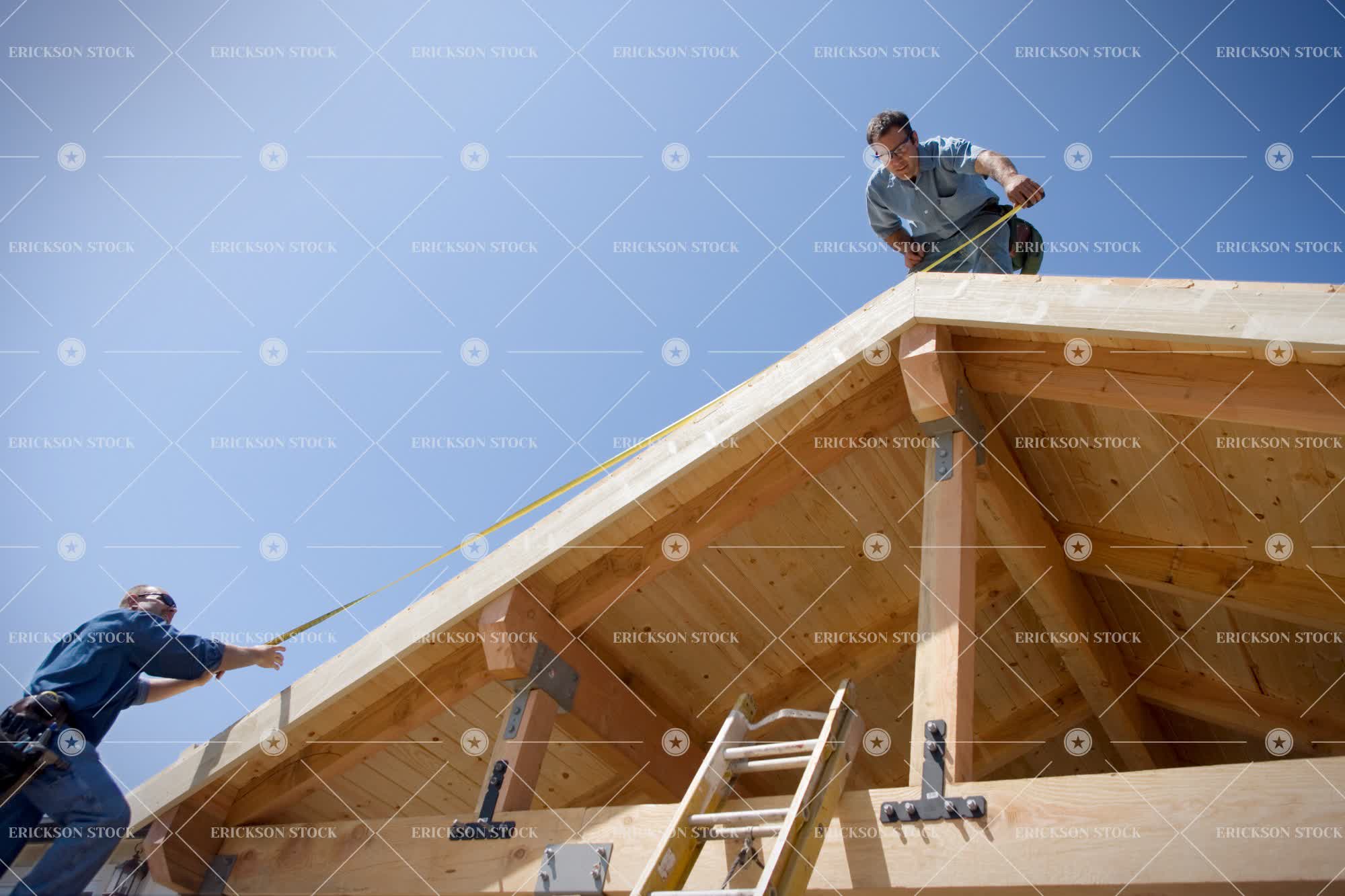 Tags architecture, beam, bend, blue sky, blueprint, brace, building, caucasian, clear sky, code, colleague, construction, construction worker, contractor, cooperate, copy space, custom, day, foreman, framing, hammer, horizontal, house, house framing, housing boom, job, jobs, joist, Ladder, ladders, license, low angle view, man, measuring, mid adult, nails, occupation, only males, only men, outdoors, people, reading, remodel, remodeling, roof, Side view, standing, sunny, Support, tape measure, Teamwork, three quarter length, tool, trade, trades, two people, union, vocation, vocations, wood, working, working together, zoning