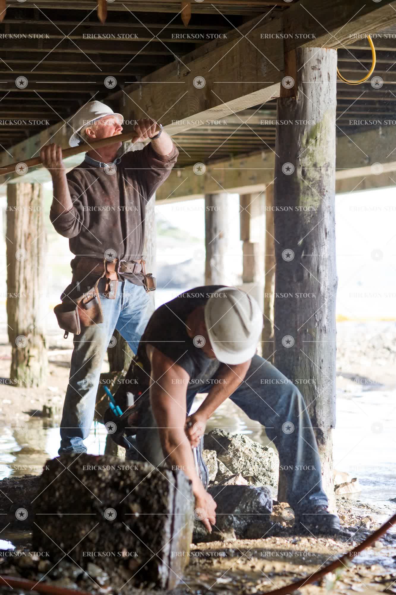 Two male construction workers working underneath a building on a construction site.