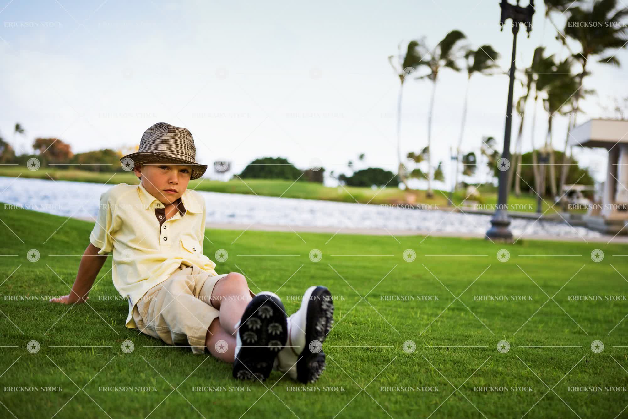 Bored young boy sits on the grass of a golf course for a portrait.