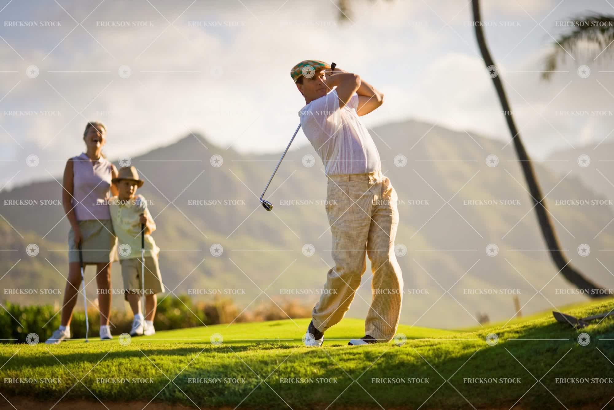 Man plays golf as a woman and young boy look on.
