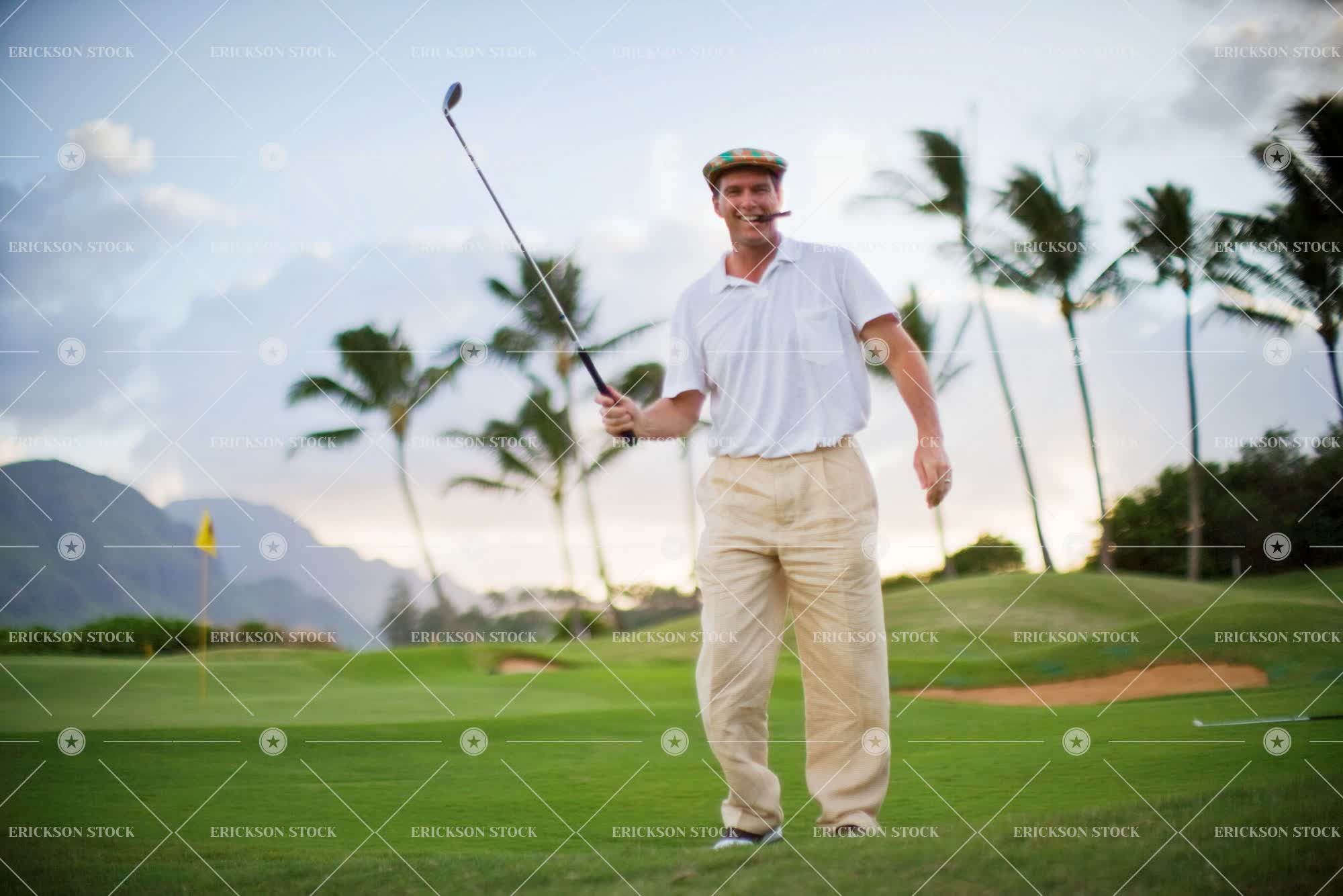 Tags adult, assure, bad habit, cap, caucasian, cheerful, cigar, cloud, confident, copy space, country club, day, delight, enjoyment, Eye contact, full length, golf, golf bunker, golf bunkers, golf club, golf clubs, golf course, golf courses, golf player, golf players, golfer, golfers, golfing, grass, grassy, green, Growth, habit, habits, happiness, happy, hat, hats, hobbies, hobby, hold aloft, holding aloft, horizontal, joy, joyful, lawn, lawns, leisure, leisure activities, leisure activity, look at camera, looking at camera, male, man, mature adult, mid adult, natural, nature, negative space, one person, outdoor, outdoors, outside, palm, palm tree, palm trees, palms, people, person, playing golf, recreation, recreational pursuit, sand, sand trap, sand traps, sandy, selective focus, self-assured, self-confident, smile, smiling, smoking, smoking issues, smug, sport, Sports, trap, traps, Tree, trees, unhealthy, unhealthy living, young adult