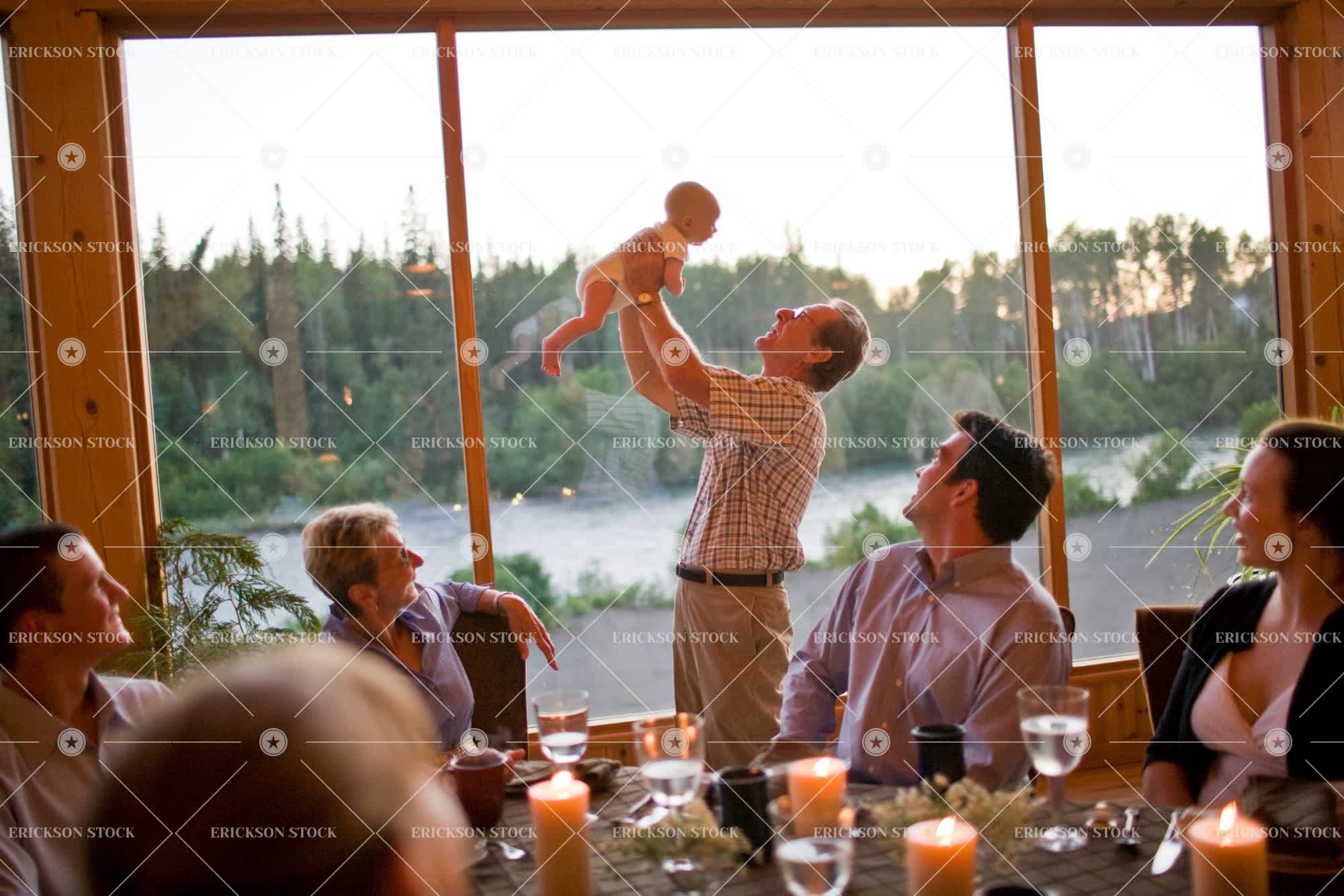 Grandfather holding up baby with family watching from the dinner table